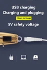 Kemei KM-127 Metal Rechargeable Cordless Hair Clipper Trimmer Pro Barber Machine Features: 100% brand new and high quality. The adjustable clipping comb (1 / 2 / 3mm) is applicable for clipping hair of different length. Carbon steel cutter head, sharp, never cut hair, no hurt to skin, low noise. USB rechargeable, charging 2 hours last 150min. It adopts the high-hardness hair clipper blades. Super nice design, with cutting length control wheel. Fit for both baby, kids and adults. Cutting the hair just like combing the hair, quickly, easily and safe. Great gift to kids, parents, friends. Specification Product Name: E lectric H air C lipper Model: KM-127 Material: ABS + S tainless steel cutter head Color: Gold, Silver Net weight: 320 g / 12oz Body size: 1 8 x 4 x 3 cm (7.09 x 1. 57 x 1. 18 " ) Charging time: 2 h Use time: 150min s Voltage: 100-240V 50/60H z Power: 12 W Power mode: USB rechargeable Packing size: 18 x 9.5 x 6 cm (7.09x 3.74 x 2.36 ” ) Gross weight: 500 g / 19oz Cleaning method: knife head washing Package Included: 1 x Hair Clipper 3 x Limit Combs (1mm /2mm /3mm) 1 x Cleaning Brush 1 x USB Cable 1 x User Manual