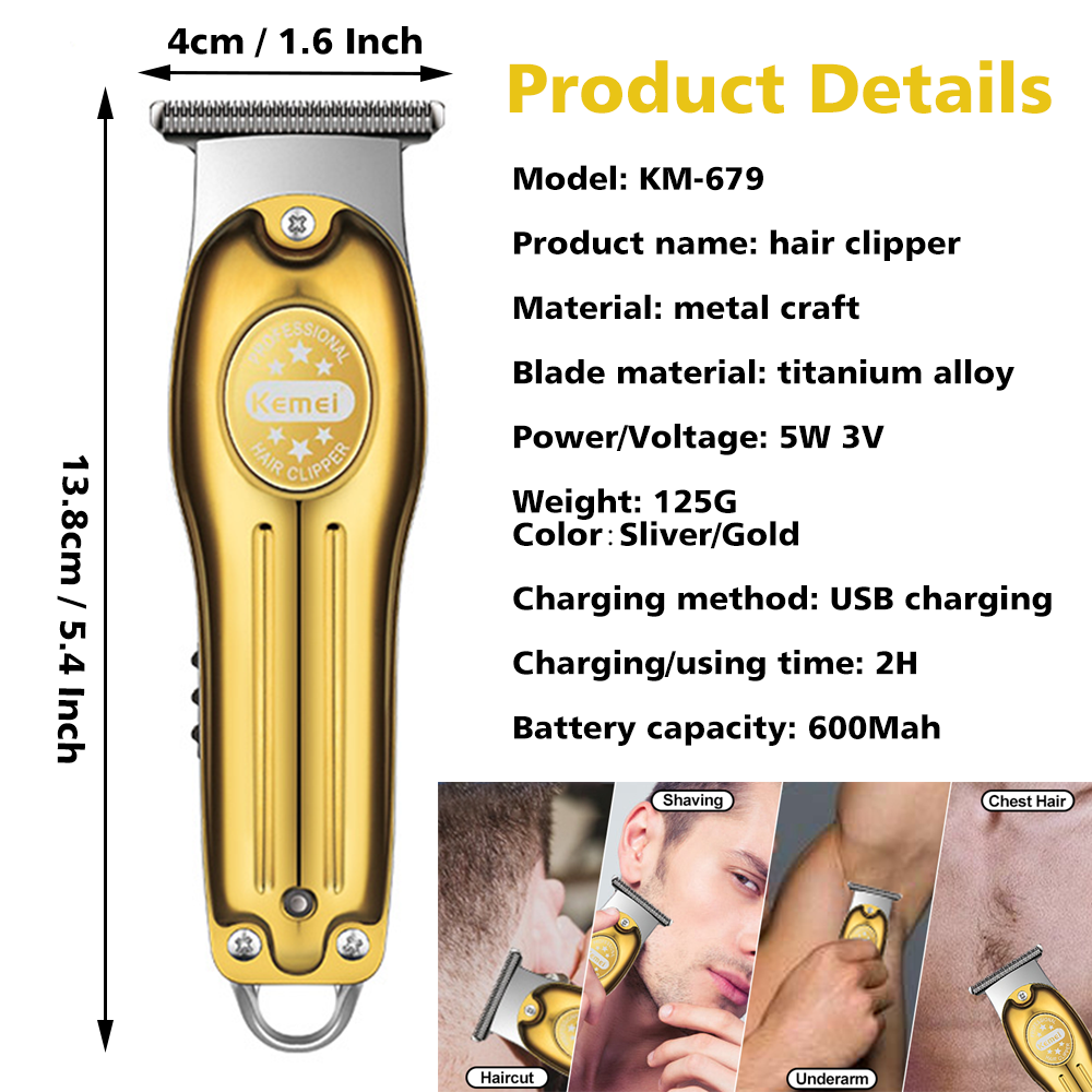 Describe: Professional barber tool, or use at home. Stainless steel blade, avoid skin irritation, very hot, does not pull hair, blade width 45mm. Low noise, high power. Ergonomic and stylish handle design, comfortable to hold and operate. Note: Due to air transport restrictions, liquids cannot be transported, so oil bottles are not included in the package, please note. Due to manual measurement, there is a size error of about 1-5mm. Due to different monitor calibrations, the colors of the items shown in the photos may appear slightly different on your computer monitor. Product parameters : Brand: Kemei Model: KM-679 Product name: hair clipper Color options: Gold Charging method: USB charging Battery Weight: 600mAh Voltage/Power: 3.7V/5W Weight size: 125g/4*13.8cm Use time: 2 hours of charging, 100 minutes of use Product acessorie s : 1*Host 1*protective cover 3*limiting comb (1/2/3)mm 1*USB cable 1*Cleaning brush