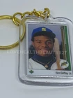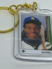 Ken Griffey Jr. 1989 Upper Deck Rookie Card #1 Replica Gold Key Chain! Handcrafted replica sports card key chain of Ken Griffey Jr's Seattle Mariners Rookie card. Card is made on a glossy vinyl with laminate to provide a realistic looking mini replica. Perfect as a gift or stocking stuffer for any Ken Griffey Jr. fan or yourself! Makes a great conversation starter amongst card collectors and enthusiasts and a great addition to your personal key set. Card size is approximately 1 1/2" long by 1" wide. Key chain size is 1 13/16" long by 1 5/8" wide. Comes with extended gold length chain and durable gold jump ring. Ships fast! Thanks for looking!