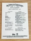 USAF CORE VALUES: INTEGRITY FIRST SERVICE BEFORE SELF EXCELLENCE IN ALL WE DO DESCRIPTION ; Ken Griffey JR Base/Inserts You Pick HOF CONDITION Please see pictures for card condition, c ards are in NrMnt - Mint condition unless otherwise identified. Identification will be in the form of a close-up picture(s) showing the issue. Please feel free to ask questions as needed. Please visit my store, LOOGY Sports Cards & Memorabilia for more listings: LOOGY (Left-handed One Out GuY) is a nod to both baseball of yesterday and to the numerous Southpaws in my family. https://www.ebay.com/str/loogysportscardsandmemorabilia FEEDBACK: I have been an eBay Member since 1998. My feedback is solid, so please purchase with confidence! Feedback is given at Shipping and is respectively requested in return. I do not believe in the practice of some sellers that requires a buyer to leave feedback prior to the seller doing so. Being a 20 Year USAF Vet, I live by the AF Core Values. If there is an issue with your purchase please let me know and we can get it worked out. Quantity Discounts I offer volume discounts on my You Pick/Complete Your Set listings. Often the volume discount will apply to all of the listings that offer the same volume discount. To gain maximum advantage of the discounts please add your selections to your cart before checking out. All qualifying promotions and discounts are automatically applied during checkout by eBay. Buyers who chose to make consecutive purchases rather than add their selections to their cart prior to checking out I reserve the right, if I choose, to cancel these orders and request that the Buyer repurchase and add all selections to their cart prior to checking out. This is due to the small margins associated with sports cards and the fees charged by eBay. In addition to charging a percentage of the purchase cost eBay also adds a standard service fee on each order. SHIPPING: Shipping is FREE to the contiguous United States. Card(s) will be shipped in a penny-sleeved and protected using the eBay Standard Envelope as appropriate which includes tracking. Orders over the eBay Standard Envelope limits will be shipped protected via USPS First Class package service in a bubble mailer with tracking at no additional charge. Shipping outside of the contiguous U.S. is through eBay's Global Shipping Program with applicable shipping costs the responsibility of the buyer. Please take a look at my other eBay listings as well before checking out. I Appreciate Your Business & Thank You for Supporting a Service Disabled Veteran USAF CORE VALUES: INTEGRITY FIRST SERVICE BEFORE SELF EXCELLENCE IN ALL WE DO