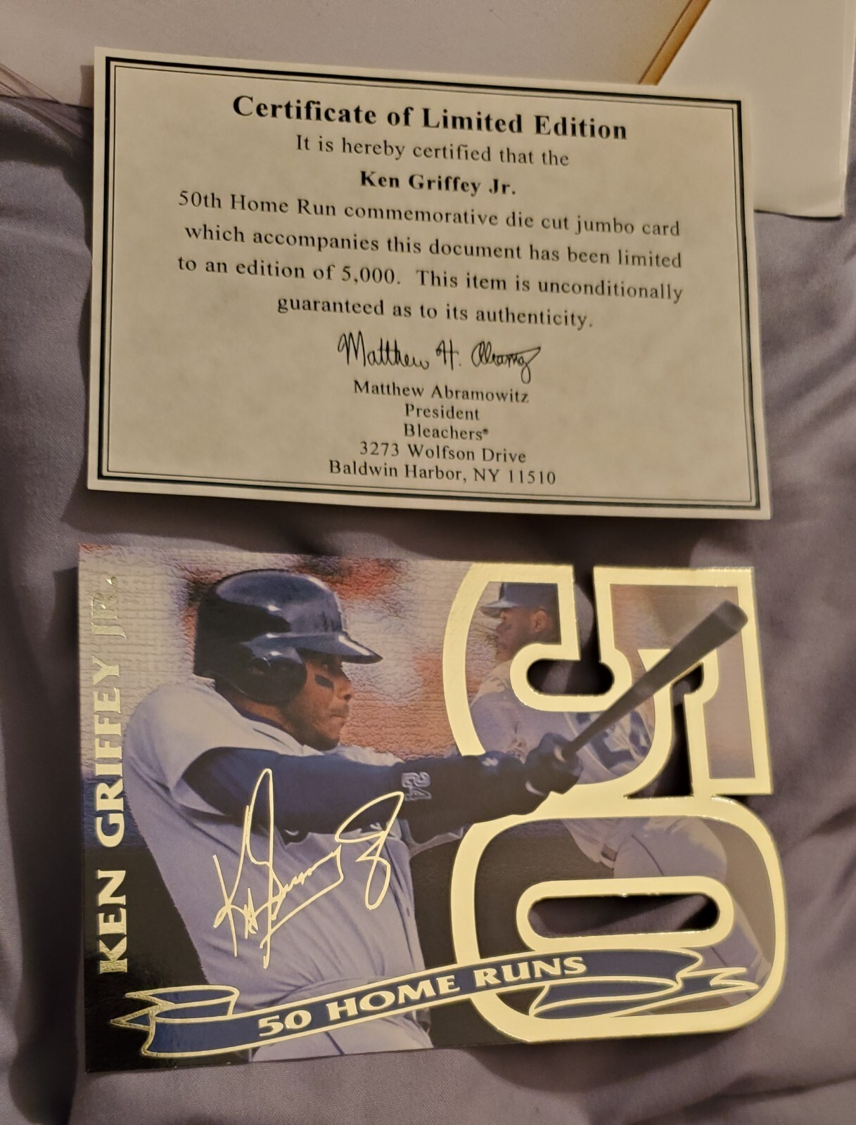 This Ken Griffey Jr oversize trading card is a must-have for any avid collector or fan. Featuring the iconic athlete in action, this sports trading card is a valuable addition to your. From a smoke free home will ship it from ARIZONA today or tomorrow free USPS shipping thanks for viewing it collection. The card size and type make it a unique find, and its pristine condition ensures its long-term value. Whether you're a fan of Ken Griffey Jr or simply appreciate the art of collecting sports trading cards, this oversize card is a rare gem. It's perfect for framing or displaying, and its mint condition is sure to impress. Don't miss your chance to own this valuable piece of sports memorabilia.
