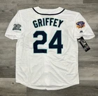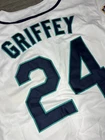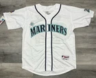 The product is a Ken Griffey Jr. Seattle Mariners 1997 Home Jersey in size Large. This jersey features a patch and is designed for men. The white jersey represents the Seattle Mariners team, with a design specifically from the 1997 regular season. It is a great item for fans of Ken Griffey Jr. and collectors of baseball memorabilia.