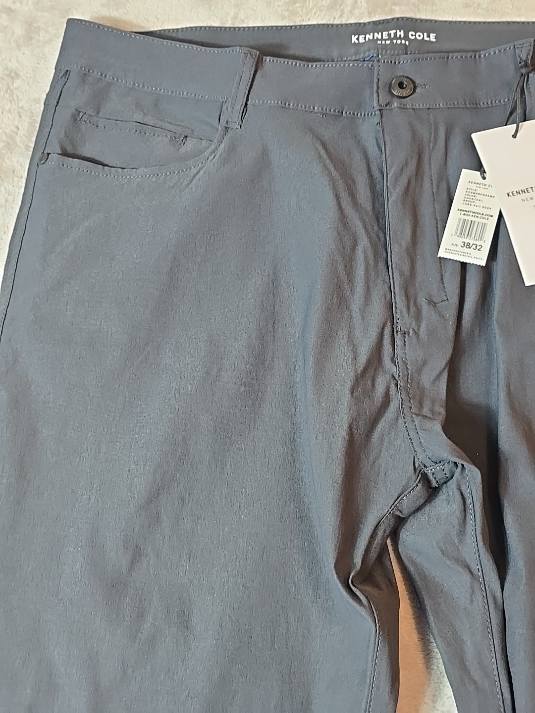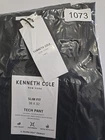 Kenneth Cole Men's 5-Pocket Tech Pants are slim fit flex pants made of nylon and nylon/spandex material. They come in a charcoal color and have a flat front with a zip/button closure. These pants are mid-rise with a 32-inch inseam and waist size of 38. They are suitable for travel and casual occasions and have accents with buttons. The pants are part of the A Techni Cole product line and have features such as easy care, lightweight, comfort, stretch, pockets, breathable, and water-resistant. They are machine washable and come in a solid pattern.