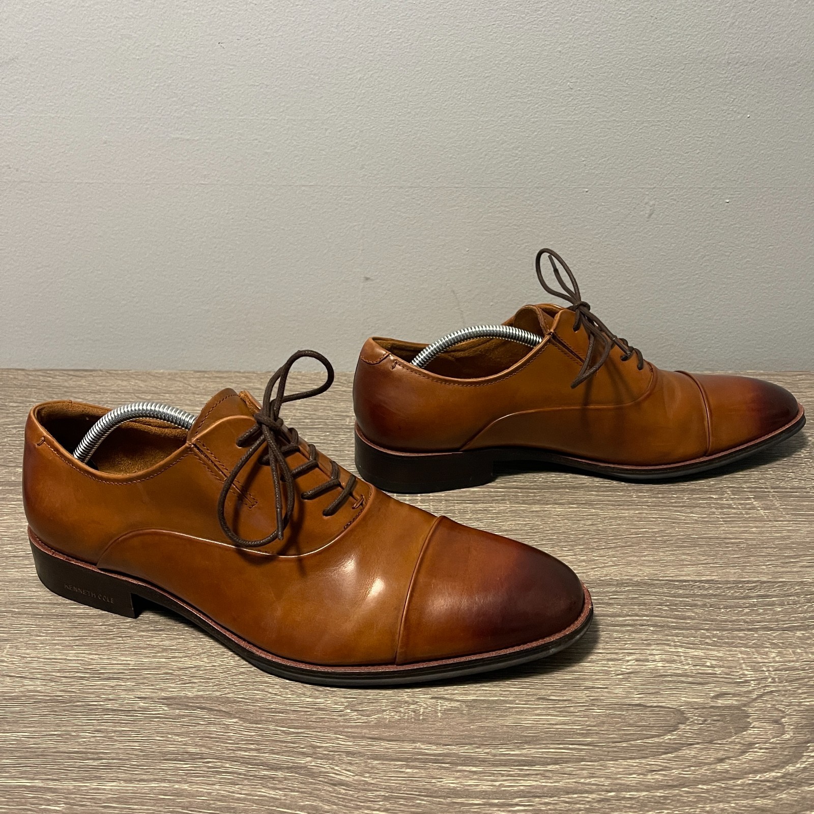 The Kenneth Cole New York Men's Tully Lace Up Cap Toe Oxford in Cognac is a stylish and versatile dress shoe for men. Featuring a classic almond toe shape and lace-up closure, these oxfords are made of high-quality leather with a durable rubber outsole. The brown color and solid pattern make them perfect for various occasions throughout the year, whether it's for a formal event or a casual outing. The Cole character and lace accents add a touch of sophistication to this timeless piece from the Kenneth Cole brand.