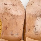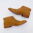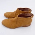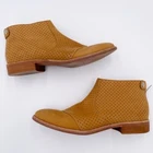 Kenneth Cole Smith 2 Perforated Ankle Boot Tan perforated leather upper Back zipper closure Strap with snap closure Size 9M Very good pre-owned condition Some minor exterior wear, mostly on soles - see photos