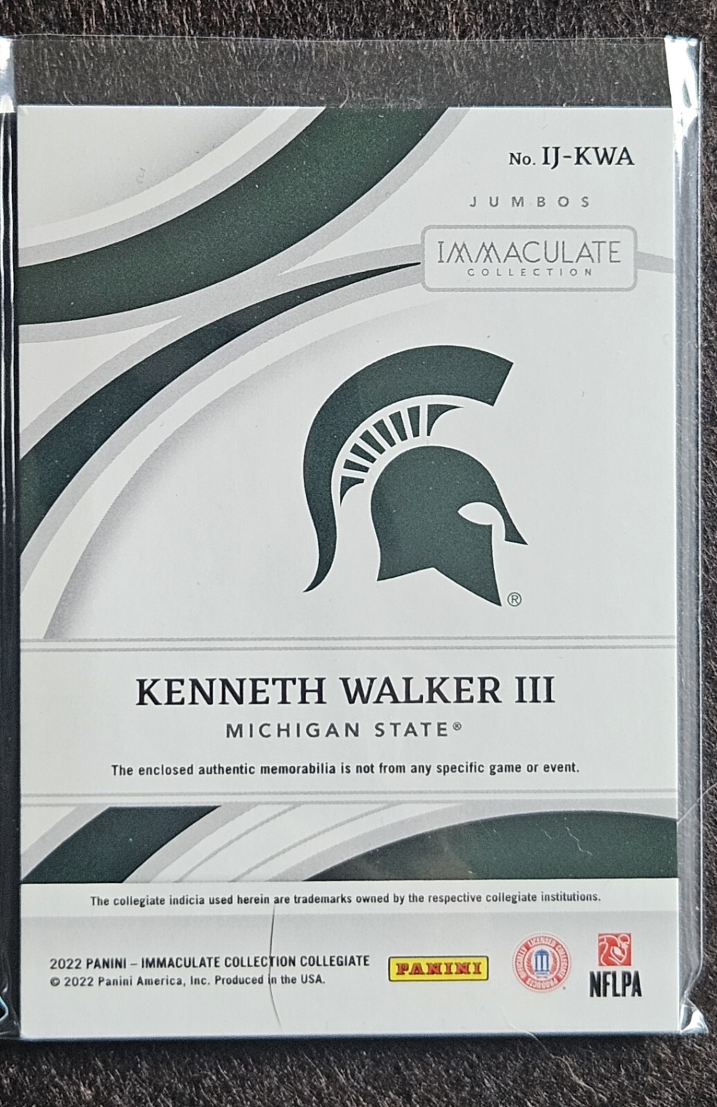 This Kenneth Walker III 2022 Panini Immaculate Collection Collegiate Jumbos is a Jersey Number Match 9/99!!! Featuring a near mint or better condition, this ungraded card has a print run of only 99 and is a Jumbo Patch parallel/variety. The card is from the National Collegiate Athletic Association (NCAA) and depicts the Michigan State Spartans player in his college uniform. The card is a memorabilia card, making it a unique addition to any collection. With its features and the season it represents, this card is a great investment for any collector. Don't miss the opportunity to own this rare piece of sports history.
