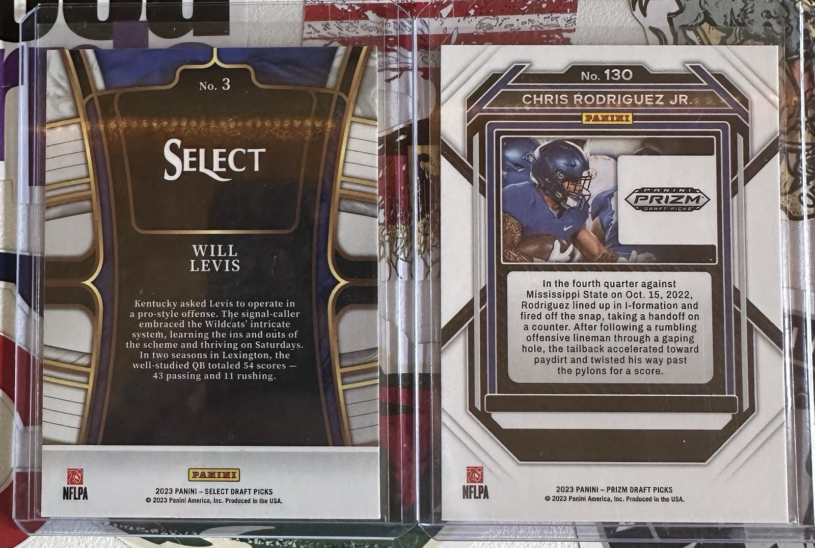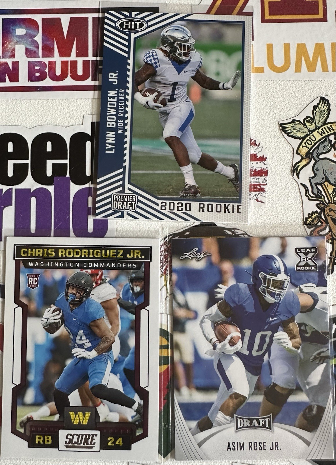 5 cards pictured included: 1. 2023 Select DP Rookie Will Levis #3. 2. 2023 Prizm DP Rookie Chris Rodriguez Jr. #130. 3. 2020 Sage Hit Rookie Lynn Bowden Jr. #1 4. 2023 Score Rookie Chris Rodriguez Jr. #330. 5. 2021 Leaf Draft Rookie Asim Rose Jr. #18.