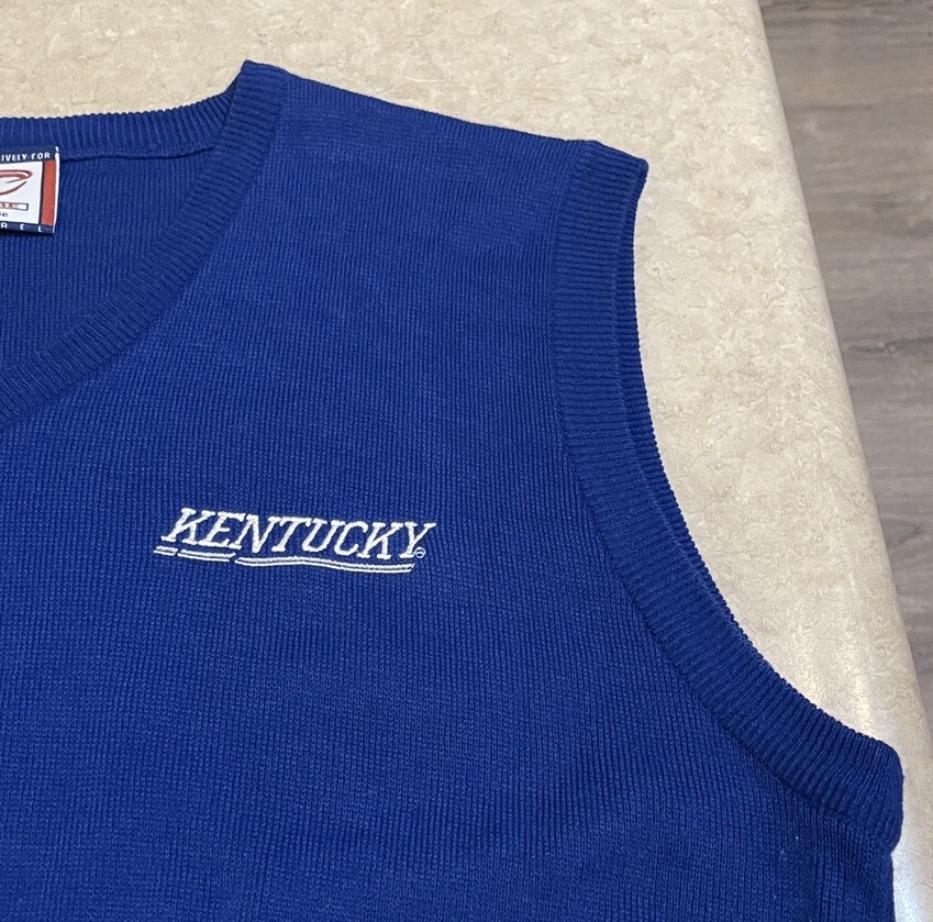 This is a blue sweater vest made by Cadre, a brand that produced it in Italy. It is officially licensed and features the Kentucky Wildcats team, which Anthony Davis played for during the NCAA Championship. The sweater is made of acrylic and is designed for men in size XL. This vest is in good preowned condition, with light signs of wear. Please see ALL photos for a better idea on condition, any measurements, or details to the vest.