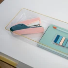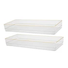 Thoughtful, functional storage is at your fingertips with this 2 pack of 15" x 6" Kerry Stackable Organizers. Clear, BPA-free plastic bins are elevated by beautiful gold trim and can be configured on demand for a custom fit in a drawer or on top of your work surface. Recessed bottoms allow the components to slide from side to side for quick access and stack vertically making them an ideal storage solution for small spaces. Non-slip feet ensure these organizer trays stay where you put them and the sophisticated, versatile design multitasks in countless other living spaces requiring tidy, clutter-free surfaces. Storage and organization can be beautiful as well as functional with this set of two 15" x 6" Kerry Desk Drawer Organizers Modular stack and slide design allows for multiple configurations both in-drawer and on the desktop for a custom fit Premium crack resistant and BPA free plastic composition with elevated gold trim Non-Slip feet keep each piece perfectly in place for tidy surfaces Dimensions (2) - 6"W x 15"D x 2"H