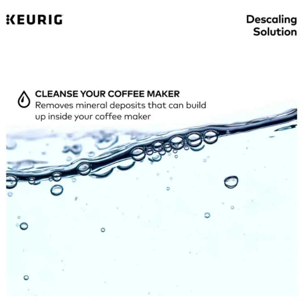 About this item Product details Keurig Descaling Solution is an important step to cleaning and caring for your Keurig coffee maker. When used every 3 months, or as often needed, Keurig Descaling Solution safely and effectively cleanses and removes mineral buildup from inside your coffee maker which can affect brewer performance, taste, and quality of your beverages. An important step of your Keurig coffee maker maintenance routine, Keurig Descaling Solution keeps your coffee maker clean, performing at its peak, and beverages tasting their best. Keurig Descaling Solution is the only Keurig recommended cleaning solution to be used with all Keurig coffee makers. Descaling is an important process that cleans the inside of your coffee maker. Over time, calcium deposits called scale can build up inside your coffee maker. If left unchecked, these buildups can affect the performance of your coffee maker and taste of your beverages. Keurig Descaling Solution is an effective, fast-acting, and odorless solution which helps clean and remove calcium and mineral deposits to keep your coffee maker clean and brewing at its best. To preserve longevity of your coffee maker, we recommend using Keurig Descaling Solution every 3 months or as often as needed (depending on the mineral content of your water, you may need to descale more frequently). Keurig Descaling Solution is compatible with all Keurig coffee makers. CLEANSE YOUR COFFEE MAKER: use every 3 months to clean and remove mineral deposits that can built up inside your coffee maker IMPROVE COFFEE TASTE: by removing mineral buildup that can affect the taste of your beverages SAFE AND GENTLE: citric acid safely cleans inside your coffee maker without harming your brewer FAST ACTING AND ODORLESS: cleanses and rinses away mineral build up without leaving behind any odor or residual taste EFFECTIVE AND EASY TO USE: clean and extend the longevity of your brewer while enjoying better tasting beverages in under 45 minutes Specifications Features Fire-Resistant Brand Keurig Manufacturer keurig Manufacturer Part Number 5000052359 Assembled Product Weight 0.88 lb Color Clear