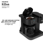 Product details The Keurig K-Duo Essentials Coffee Maker is the ideal brewer for any coffee occasion. It brews single cups using K-Cup pods AND full carafes of your favorite coffee grounds – all in one compact unit. It features a large 72 oz. removable water reservoir that feeds both sides of the brewer, which means faster, easier brewing with fewer refills. The single-cup side brews all your favorite K-Cup pod flavors in your choice of 8, 10, or 12-oz sizes. It offers the Brew Over Ice option for making refreshing iced coffees or teas, as well as the Strong Brew option, which makes a bolder, more intense flavor for your cup. On the carafe side, you can drip-brew full pots of your favorite grounds in 8, 10, or 12-cup sizes. It features a glass carafe and heating plate for keeping your coffee hot, as well as the Pause & Pour feature which allows you to pause mid-brew to serve fresh, hot coffee. Whether you’re serving a crowd or serving yourself, whether you need a pot of regular and a cup of decaf…no matter the situation, the K-Duo Essentials is the perfect solution. Available exclusively at Walmart. BREW BY THE CUP OR CARAFE: Brews both K-cup® pods and coffee grounds. ONE 72 OZ RESERVOIR: The extra-large 72 oz removable reservoir is shared by both sides for fast, convenient brewing with fewer refills. MULTIPLE BREW SIZES: Brew 8, 10, or 12-oz single cups or 8, 10, or 12-cup carafes. BREW OVER ICE: Adjusts temperature for maximum flavor and less ice melt for iced coffees and teas. STRONG BREW: Brews a stronger, more intense flavored cup. 12-CUP GLASS CARAFE: Included with brewer, along with heating plate to keep fresh coffee hot. PAUSE & POUR: Automatically pause carafe brewing mid-brew so you can serve fresh hot coffee, then return the carafe and continue the brew. COMPACT DESIGN: The versatility of two kinds of brewers in one space-saving unit.