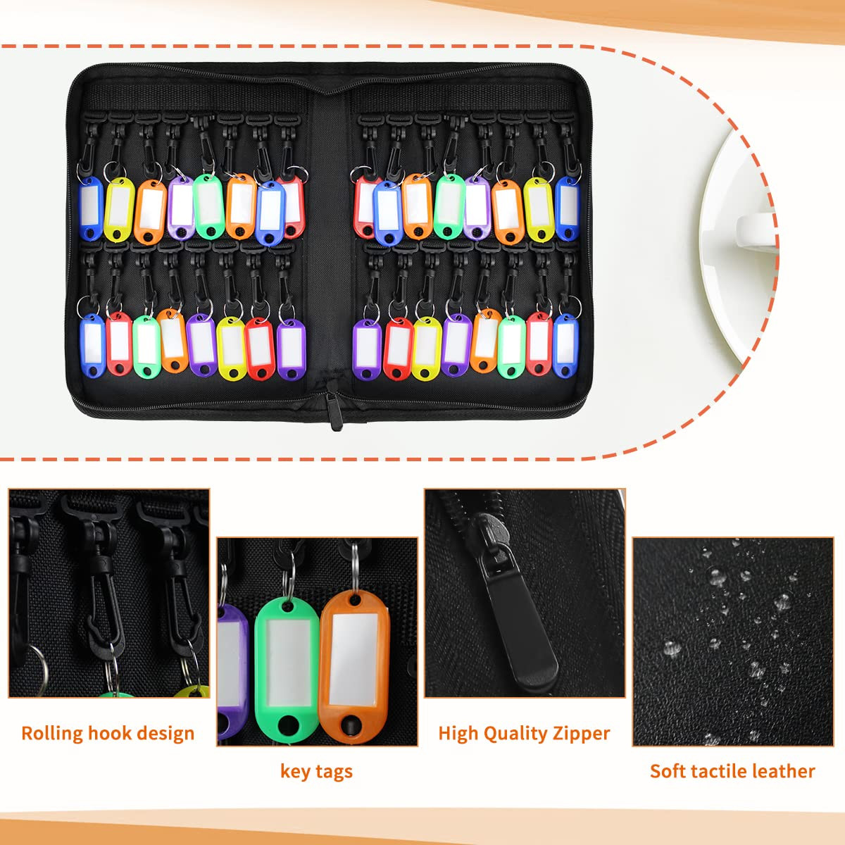 【Portable Key Organizer 】The leather key organizer measures 10.5*7.5*2 inches,large capacity can hold up to 32 keys, the key case is portable and convenient to carry around 【durable & sturdy】the portable key organizer is made of high-microfiber leather which offers extreme durability and comfortable feel,It contains 36 plastic key hooks easy to mark and distinguish keys,the key organizer keychain to Keeps your keys organized so you can find the keys you need right away 【Unique Keychain Design】The hook is made of ABS material, which is sturdy and durable. Compared with ordinary plastic, it has a longer life cycle and is not easy to age. The unique flexible rolling design of our hook is convenient for the key to be crowded due to size or other problems. It can be rotated flexibly to change the angle, and the top adopts advanced Nylon fixed, less damaged than Velcro, buttons, etc. 【Double Protection】Our key organizer case can help you organize your keys, so that you are no longer troubled by too many keys, messy, and indistinguishable. At the same time, we match a fireproof bag, which can be used with a key case to access cards, electronic cards and important contracts, or can be used alone. valuables, cards, watches, diamond rings, etc. 【Home & Business Use】:This key organizer box can be used to home keys and is also perfect for business use such as real estate rental or sales, vehicle rental, hotel, company, office, school, locker key organization
