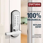 Brand: Elemake Special Feature: mechanical keypad deadbolt lock with handle Lock Type: Keypad Item dimensions : L x W x H 10.6 x 7.2 x 3.2 inches Material: Stainless Steel About this item: BEFORE YOU BUY, PLEASE KEEP IN MIND: Check that your door open direction matches the picture shown. This is not a deadbolt, but a right-handled mechanical combination door lock that doesn't require batteries CONVENIENT AND SECURE: Dual Access: Easily open the lock using either the passcode or the key; Wear-Resistant Keypad: The keypad material is wear-free, leaving no clues for thieves to follow IMPROVED DURABILITY: The lock body and latch are made of high-quality stainless steel 304, ensuring long-lasting durability and resistance to corrosion, difficult to pry open. The keypad is also wear-free, it is an ideal choice for those who want a mechanical lock that is easy to use and hard to break DESIGNED FOR SINGLE-BORE DOORS: so 4 additional holes will need to be drilled for installation. Do not use in conjunction with a deadbolt as there may not be enough space, The lock does not automatically lock, when unlocked, the door will stay that way until you pull up the handle to lock it(which can be a pro or con depending on your needs) DESIGNED FOR EASY DIY INSTALLATION: Choose a combination of 4-8 digits (no repeats) for your passcode. Please note that the combination code can be used in any order. The lock can be easily reset to a new combination in just a few simple steps. This feature ensures that you can change the passcode regularly for added security TRUSTED QUALITY AND SATISFACTION SERVICE -- Enjoy peace of mind with Elemake's 10-year factory service, If you are unsatisfied with your purchase, simply contact us for a refund or replacement DOOR COMPATIBILITY: Full Size 7.67" x 2.44" (195 x 62mm). Maximum Applicable Bore Size 2 – 1/8"; Both 2-3/8"(60mm) & 2 - 3/4"(70mm) Backsets/Latches. Suitable For Wood, Metal, Plastic Door Thickness Within 35-50mm Product Description: 1. Easy to install, With installation instructions or website. 2. No batteries required.100% Stainless Steel 304 mechanical door lock 3. Safe, durable, hand-held, humanized 4. Does not lock automatically (this is a pro or a con depending on your need) Feature: The lock will stay unlocked until the handle is lifted up. once unlocked you can come and go as needed without having to re-enter the code The lock is a bump proof pick proof keyless mechanical door lock and it does not require wires, batteries or electricity The lock handle must be "pushed up" to reset clear buttons and lock the lock The lock provides keyless security, the combination can be 4-8 digits with tumblers provide is easy to install ,use and change The lock fits most doors and are all weather proof This lock can be used for exterior as well as interior doors The lock has a lever handle on the outside as well as inside Warm Tips: 1.Only for the door opens inward 2.Not deadbolt 3.Only for single bore 4.Need to drill additional 4 holes for the fasteners 5.The handle must be "pushed up" to reset clear buttons and lock the lock 6.Combination password settings can be 4-8 digits, You can enter the number you set to unlock, and can be in any order Specification: Maximum borehole diameter 2-1/8" Never grow faded/worn, Anti-friction spring latch BOTH 2-3/8"(60mm) & 2- 3/4"(70mm) Backsets/Latches 50.60 single tongue lock body Dimensions:195x62mm(Full Size),Wood or metal, plastic door thickness within 35-50mm Package Included: 1 x Handed Door Lock Set (Necessary bolts are included)