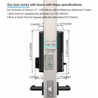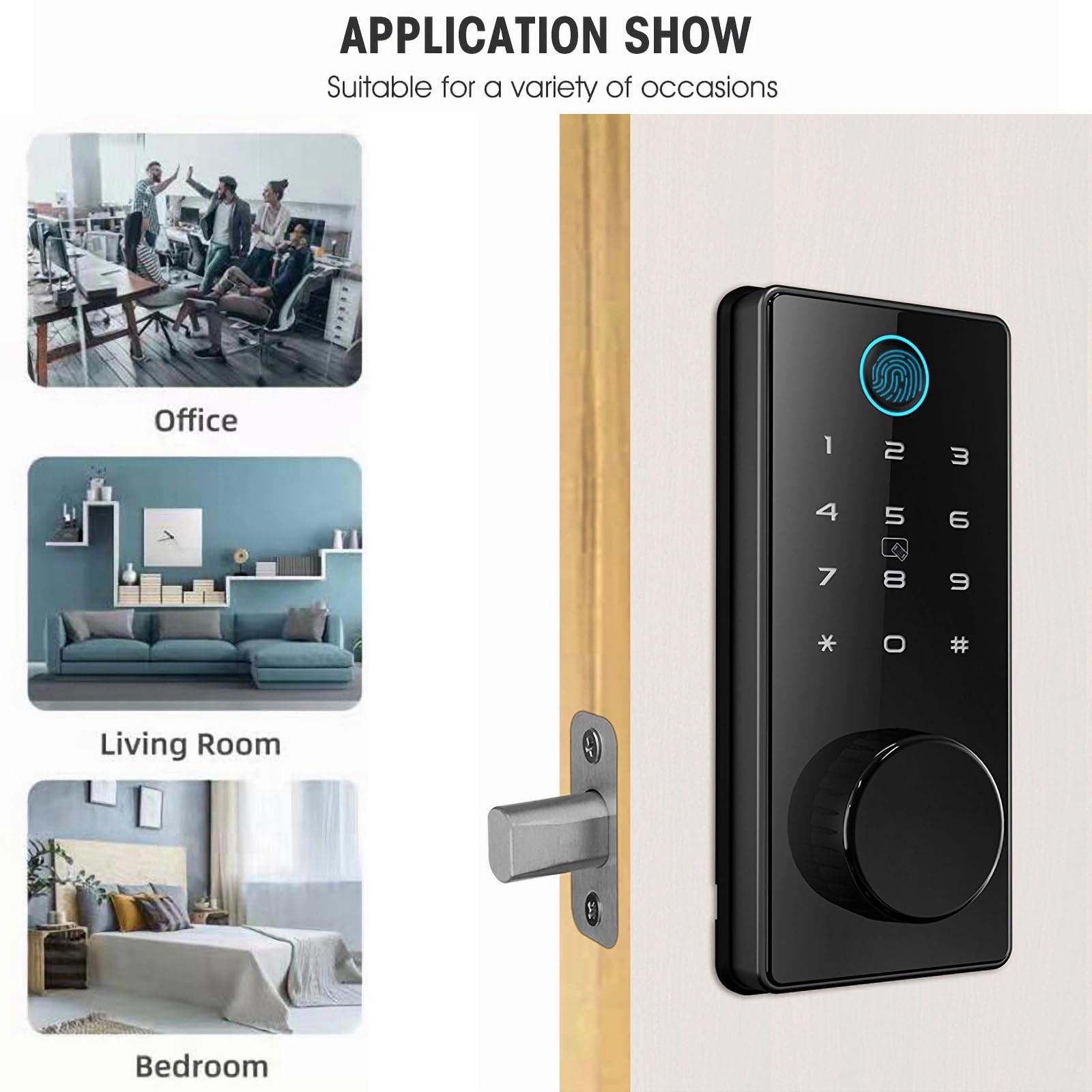 DETAILS: Bluetooth standard:Bluetooth 4.1ble Supported mobile phone:Android 4.3 / iOS 7.0 or above Power supply mode:4pcs alkaline dry batteries Low voltage alarm:4.8V Voltage range: 4.5~6V Standby current: 65 microamps Working current: Less than 200 Ma Unlocking time: 1.5 seconds Operating temperature:-20~70°C Product Size: 73.6*162.6*26.2mm Key type:Capacitive touch button IC cards Capacity:Mifare M card 200 Unlocking Ways:App, password, fingerprint, IC card, mechanical key Fingerprint head type:Semiconductor fingerprint head Fingerprint capacity:120 pieces FAR:<0.001% FRR:<1.0% Passwords Capacity:Custom and permanent password 150, Other dynamic passwords 150 Keyless Entry: Unlock your door effortlessly with the smart lock's touchscreen keypad, app remote control, fingerprint scanner, IC card, or mechanical key. Convenient Control: Manage access from anywhere using the app on your smartphone via Bluetooth connection. Choose between password, fingerprint, IC card, or traditional key for secure entry Easy Installation: Simple setup process with all necessary hardware and instructions included allows for quick replacement of existing lock hardware Durable Construction: Sturdy build designed to withstand daily use and environmental conditions. The mechanical key provides a reliable alternative entry method in case of low battery or connectivity issues Mobile App Control: Manage access permissions and monitor lock activity remotely via a user-friendly app. Personalize access by assigning temporary or permanent passwords to trusted individuals
