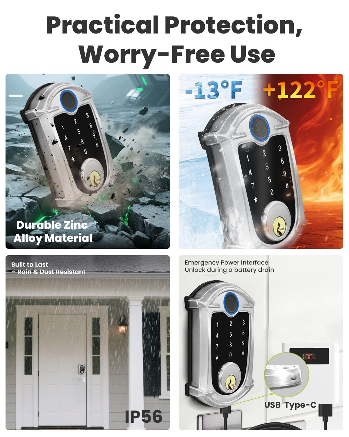 The UF02 Smart Lock is a durable, modern security solution available in venetian bronze and satin nickel finishes. Constructed from zinc alloy, it fits standard wooden doors (35mm-55mm thickness) with an adjustable backset of 60mm or 70mm. It supports 250 user codes, 10 master codes, 10 one-time codes, and stores up to 100 fingerprints. MULTIFUNCTIONAL LOCK: Lock and unlock using our fingerprint scanner, keypad, key fob or the provided keys. In case of a battery drain, the Type-C USB connector on the exterior plate can connect to a power bank for emergency power. Our smart keyless entry door lock features an automatic door lock function that can be set to auto-lock within 0 to 30 seconds STRAIGHTFORWARD INSTALLATION: Easily adjustable for various door sizes, our smart lock can replace existing locks in minutes with just a screwdriver. It is compatible with both left and right-hand doors, accommodating door thicknesses from 1.38" to 2.16". Enjoy the convenience of keyless entry, eliminating the need for locksmiths BUILT FOR DURABILITY AND SECURITY: Featuring solid construction that meets ANSI security standards, this smart lock is tested for over 100,000 lock/unlock cycles and boasts IP56 dustproof and waterproof ratings. It's weather-resistant for extreme conditions. With advanced security features like auto-lock, one-touch locking, virtual code, temporary password and low battery alert, your home is fortified against unauthorized access MULTIPLE WAYS TO ACCESS: The smart deadbolt with keypad offers versatile access methods. Easily share access with guests and monitor activity in real-time via Bluetooth. It supports up to 250 user codes, one-time codes, 100 fingerprints, and includes 2 key fobs and 2 physical keys. The lock is powered by 4 AA batteries, which can last for more than 1 year. These door locks are essential for self-housing, offices, and rental property management PROFESSIONAL SALES TEAM: is committed to providing quality products and excellent customer service. We rigorously check and control every aspect of our products. If you have any questions about our front door lock, please get in touch with us—we are at your service