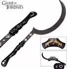 The product is a 39.5-inch replica of Khal Drogo's arakh from the TV series Game of Thrones. The sword is made of Valyrian steel, with a stainless steel blade and a handle. It is designed for ambidextrous use and comes in a multi-colored finish. This collectible item is an original replica produced by HBO and has only been on display was never used. It is a must-have for fans of Game of Thrones looking to add a piece of iconic weaponry to their collection. Please see photos to assess condition. Sold as is. Final sale. Will be shipped securely. Thanks for looking.