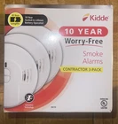 The Kidde Smoke Detector Fire Alarm 3 Pack includes smoke detectors powered by lithium batteries with a 10-year lifespan. Each detector is white in color, has a slim depth of 1.55 inches, and a width of 5.6 inches. The bundle comes with three detectors, all featuring a built-in lithium battery for long-lasting power.