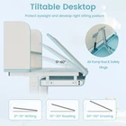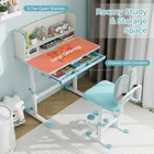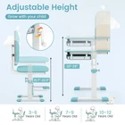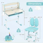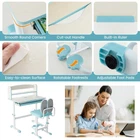 Kids Activity Chair & Tiltable Desktop Set Adjustable W/Drawer & 2-Tier Shelves ● Adjustable Height: The tabletop height is adjustable from 20"-29" and the seat height is adjustable from 15.7"-20.5". This height-adjustable study desk and chair set is designed to grow with your child, ensuring it's always the right fit for children aged 3-12. ● Tiltable Desktop: The kids desk features a 0°-60° tiltable desktop, allowing your child to find the perfect angle for every task, such as writing, reading, drawing, etc. It helps protect eyesight and develop the right sitting posture. With the air pump rod and safety hinge, the desktop can be lifted smoothly and steadily. ● Ergonomic and Comfy Chair: Equipped with thick and high-density sponge cushion, the chair is comfortable to sit in. Besides, the adaptive double backrest and rotatable footrests provide unparalleled comfort and ergonomic support during long study sessions. ● Roomy Storage Space: The large desktop is complete with a built-in ruler for precision on projects and art. Moreover, the study table comes with 2-tier open shelves and a drawer with dividers, keeping kids' items organized and within arm's reach. ● Stable and Safe Design: Supported by thickened metal tubes and equipped with adjustable foot pads, the kids desk and chair set ensures excellent stability and load capacity. Additionally, the cut-out handle design and smooth round corners provide a safe and reliable study space for kids. Color: Blue Material: MDF, Metal, PP, Mesh Fabric, Sponge Table Dimensions: 31.5" x 20"x 32"-41" (L x W x H) Chair Dimensions: 19" x 15.5" x 30.5"-35" (L x W x H) Tabletop Height: 20"-29" Tiltable Tabletop Dimensions: 31.5" x 14" (L x W) Drawer Dimensions: 26" x 11.5"x 1.5" (L x W x H) Seat Size: 15.5" x 15.5" (L x W) Backrest Size: 13.5" x 12" (L x H) Seat Height: 15.7"-20.5" Net Weight of Table: 35 lbs Net Weigh of Chair: 13 lbs Weight Capacity of Table: 220 lbs Weight Capacity of Chair: 220lbs Suitable Age: 3-12 Years Old