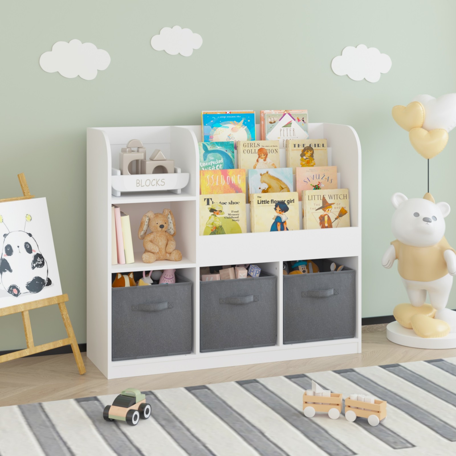 Product KeyWord You can place the bookcase in the children's room, living room and playroom, etc. Also, the bookcase is suitable for kids' height, and display books' name on the front, so that children can quickly find their books. Quite easy to assemble with detailed instructions and all the needed accessories. The bookcase adopts MDF, and holds heavy books without rip apart. The bookcase adopts MDF, and holds heavy books without rip apart. Multi-layer bookshelf has large capacity and can store various books and toys This product is equipped with an anti rollover device, you can use it confidence Product Description ◆ You can place the bookcase in the children's room, living room and playroom, etc. Also, the bookcase is suitable for kids' height, and display books' name on the front, so that children can quickly find their books. ◆ Quite easy to assemble with detailed instructions and all the needed accessories. ◆ The bookcase adopts MDF, and holds heavy books without rip apart. ◆ The bookcase adopts MDF, and holds heavy books without rip apart. Multi-layer bookshelf has large capacity and can store various books and toys ◆ This product is equipped with an anti rollover device, you can use it confidence ◆ You can place the bookcase in the children's room, living room and playroom, etc. Also, the bookcase is suitable for kids' height, and display books' name on the front, so that children can quickly find their books. ◆ Quite easy to assemble with detailed instructions and all the needed accessories. ◆ The bookcase adopts MDF, and holds heavy books without rip apart. ◆ The bookcase adopts MDF, and holds heavy books without rip apart. Multi-layer bookshelf has large capacity and can store various books and toys ◆ This product is equipped with an anti rollover device, you can use it confidence Description Kids Bookcase and Bookshelf, Multifunctional Bookcase with 3 Collapsible Fabric Drawers, Bookcase Display Stand, Toy Storage Organizer for Bedroom, Playroom, Hallway (White/Gray)