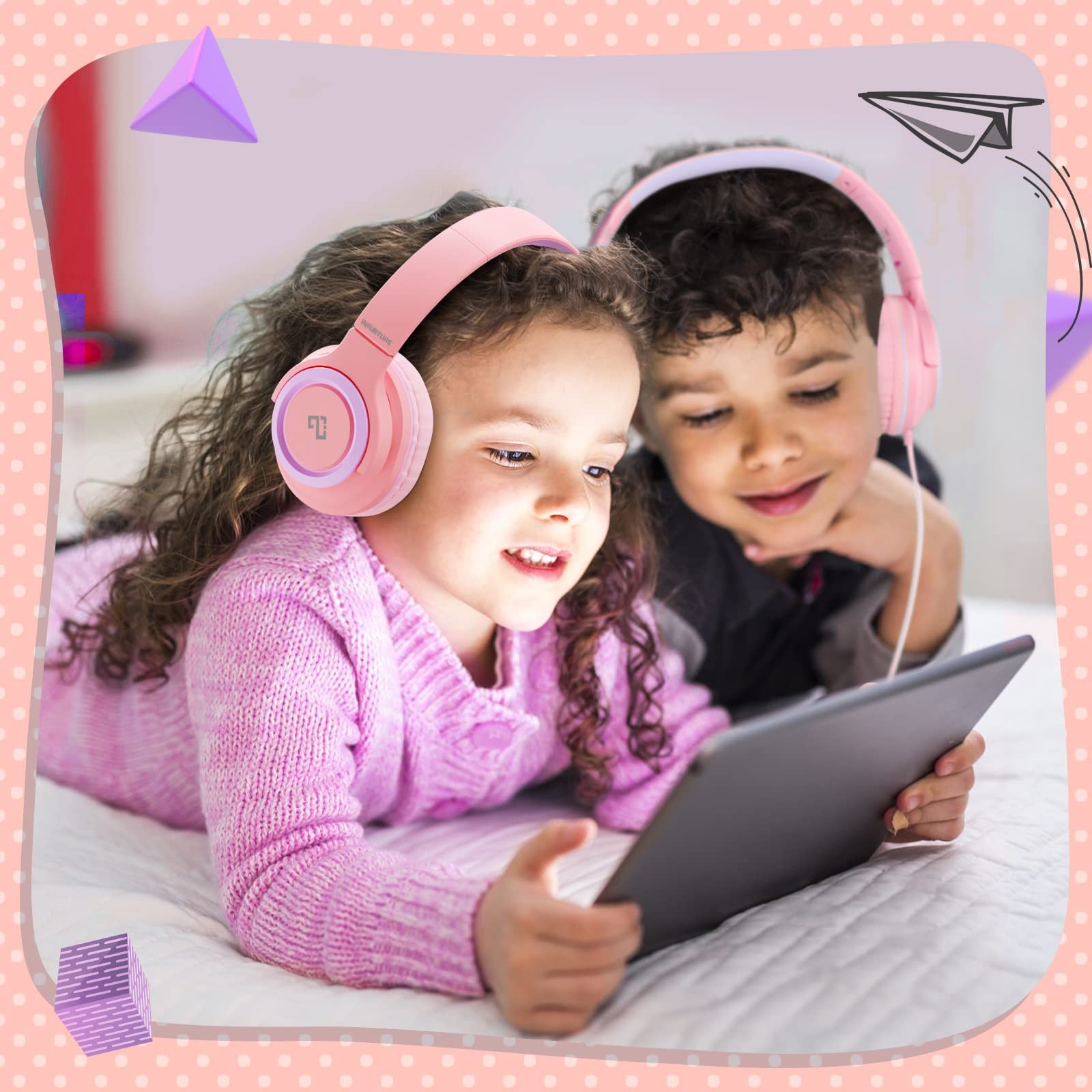 [Built-in Microphone and Excellent Compatibility]: Wired Headphones come with an in-line microphone, ideal for online classes and voice calls. These over-ear headphones are compatible with 3.5mm audio devices such as Chromebooks, Kindle Fire tablets, Switch, iPads, laptops, phones, PCs and more [Stereo 94dB Safe Volume Control]: Our kids earphones make excellent stereo sound, perfect for playing games and listening to music. And the volume can be limited to 94dB, under the condition of clear sound, it can protect children's ears from daily noise [Lightweight and Foldable Design]: Lightweight design suitable for children aged 3 and above. It's light. Foldable design, more compact storage, easy to carry, you can easily put it in suitcases and bags [DURABLE AND TANGLE-FREE]: The headphone construction is durable and sturdy plastic. The rope is braided in nylon, very durable and tangle free Designed for kids, kids, girls, boys, kids and schools [Generous Warranty]: At , we always put our customers first. You are entitled to 24-hour customer-friendly support. If you have any questions, please feel free to contact us.