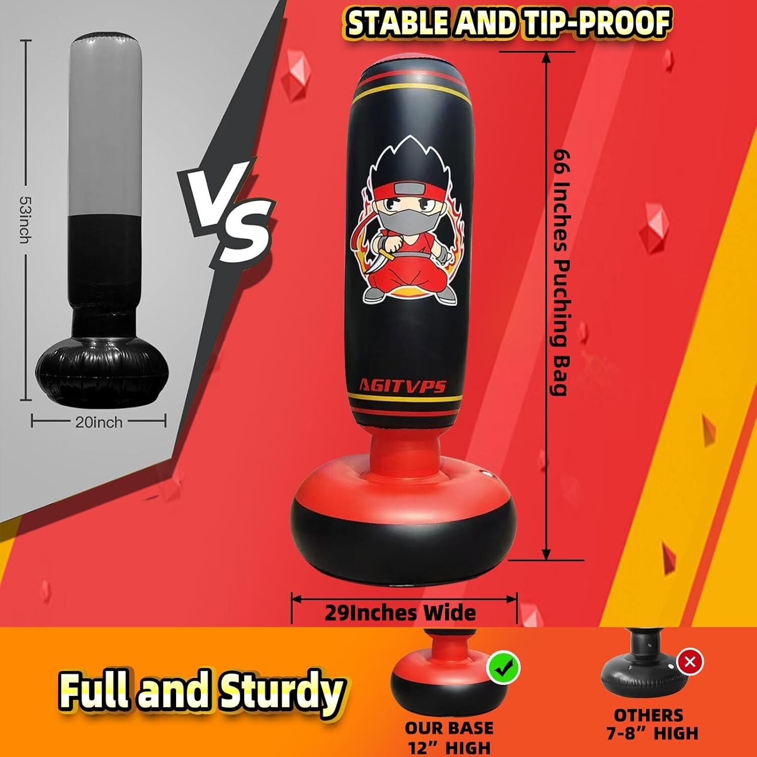 Sturdy Inflatable Punching Bag with Gloves for Kids 8-12 - Easy Setup Included ‹ › ‹ › ‹ › ‹ › ‹ › ‹ › ‹ › ‹ › Sturdy Inflatable Punching Bag with Gloves for Kids 8-12 - Perfect for Physical Activity and Fun Features: Perfect Gift: Fun ninja design captivates kids, promoting physical activity and stress relief through playful fighting. Suitable for Ages 8-12: 66-inch large punching bag made from thick, tear-resistant PVC, designed for robust performance and resilience. Stable and Tip-Proof: 29-inch full base can be filled with sand or water to withstand significant force, allowing kids to play freely and safely. Easy to Assemble: Quick ten-minute setup, complete with a Super Air Pump for fast inflation and leak-proof nozzles. Weekly maintenance keeps it in top shape. Complete Kids Boxing Set: Includes the 66-inch Punching Bag, children’s boxing gloves, Super Air Pump, instruction manual, and two repair patches for peace of mind. Benefits: Encourages interactive play for children and adults, fostering bonding and communication. Promotes physical fitness and coordination while having fun. Durable materials ensure long-lasting use and safe play. Space-efficient design allows for easy setup in various locations. Why choose our Sturdy Inflatable Punching Bag? Elevate your child's playtime with our sturdy inflatable punching bag, designed especially for kids aged 8-12. Not only does it provide a fun, engaging way to stay active, but it also enhances coordination and relieves stress. With its vibrant ninja design, your child will be excited to practice kicks and punches, all while developing their physical abilities. Don't let the fun stop—equip your child with our complete boxing set and watch them unleash their energy. Order now and give the gift of play, fitness, and bonding today! Shipping Free & Fast Shipping - We offer free shipping to most of the USA with a normal delivery time of 3-10 businessdays. However, due to various situations, additional delivery time (up to 3 weeks) may be required for some items. Alternative Carriers - We may use alternative carriers (e.g. USPS, FedEx, UPS, etc.) to ensure your package arrives safely and on time. Due to the use of multiple carriers, we are unable to provide a tracking number automatically. Handling Time - Orders are processed and shipped within 1-5 business days of receiving cleared payment. Shipping Restrictions - Shipping to Alaska, Hawaii, Puerto Rico, Guam, and other US territories may incur shipping charges or delivery restrictions. Please contact us before ordering, or your order can be refunded/cancelled. State Restrictions - There may be restrictions based on your state of purchase. For example, certain items may not be shipped to California due to state regulations. Contact for Tracking Updates - If you require tracking updates or have any concerns about the delivery of your order, please feel free to contact us, and we will be happy to assist you. Return Please see our ebay return policy. We do not accept return on most products. This is to avoid customers mis-using ebay returns. All sales are final. Please be sure to check the return policy listed at the top of the listing. In rare cases, we may accept returns, if the buyer pays both ways shipping and 20% restocking fee. If you are un-sure of return policy of a particular item, please ask before buying. Payment We accept all major credit cards, PayPal, and Apple Pay for your convenience. Your payment information is secure and encrypted to ensure a safe and seamless transaction. Please complete your payment within 3 days of purchase to avoid any delays in shipping. Feedback Your feedback is extremely important to us. We strive to provide the best products and customer service possible. If you are satisfied with your purchase, please take a moment to leave us a positive review. If you have any concerns or issues with your order, please contact us before leaving negative feedback. We are committed to resolving any problems and ensuring your satisfaction. Contact Us If you have any questions or concerns, please feel free to reach out to our customer support team. You can contact us through the eBay messaging system. We are available Monday to Friday, 9:00 am to 5:00 pm EST, and we will do our best to respond to your inquiry within 24 hours. Buy it now and enjoy a pleasant shopping experience! UPC: Not Set MPN: Not Set Model: Not Set Unit Quantity: 1.55 Brand: Unbranded Type: Standing Bag Color: Black Country/Region of Manufacture: Not Set Unit Type: Not Set