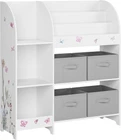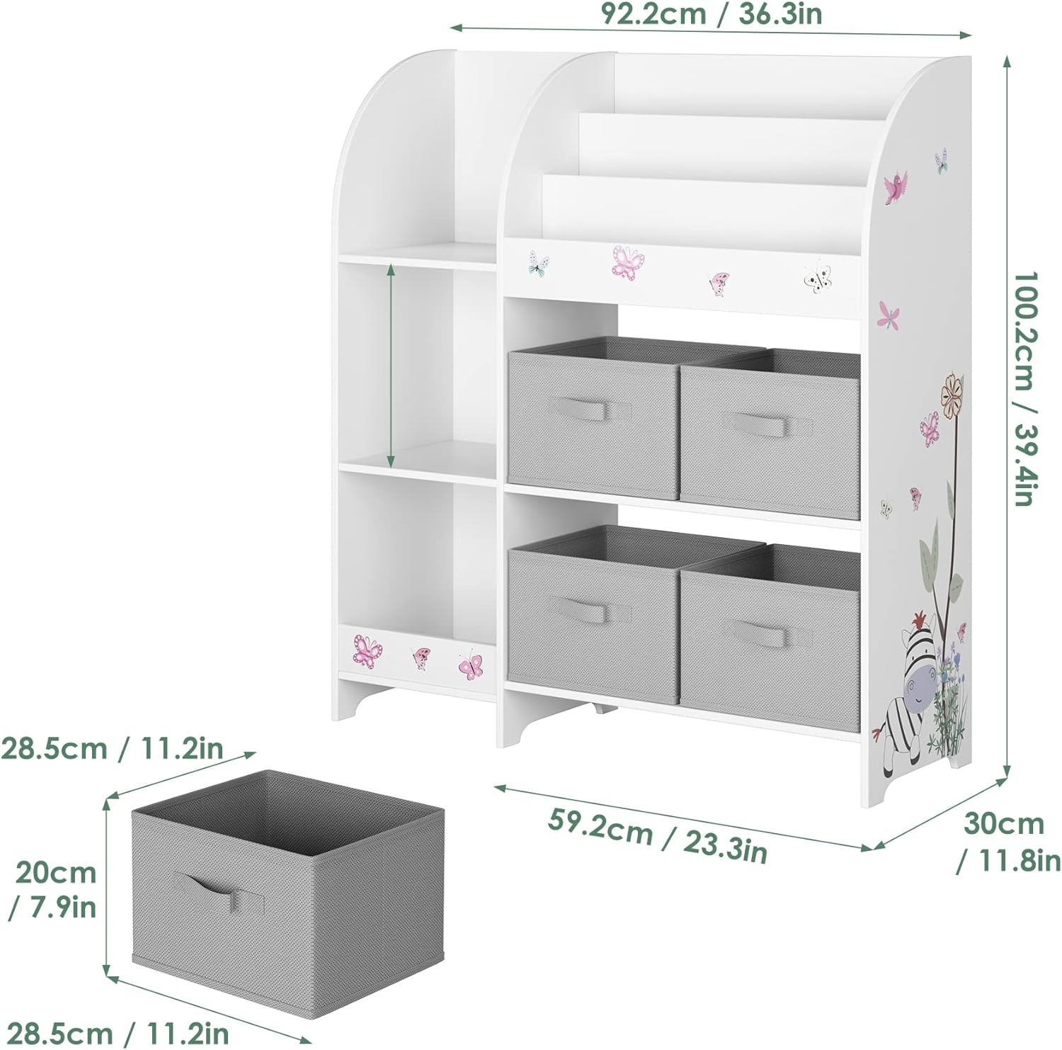Product Description About this item DESIGNED WITH CHILDREN IN MIND: Our toy organizer includes 4 storage boxes made of soft and lightweight fabrics. The kid's bookshelf features polished corners with smooth arcs, ensuring safety for little ones. Additionally, we include anti-tipping accessories to connect this storage organizer to the wall, providing a secure and reliable way to organize toys CLASSIFIED STORAGE: Our children's large toy organizers and storage offers a variety of storage options to keep your child's toys, books, and building blocks organized. Equipped with 4 detachable fabric drawers, open compartments, and book and newspaper racks, this unit allows for easy classification and storage. Not only does it keep your child's space tidy, but it also helps improve their organizational and reading skills RELIABLE MATERIAL: This toy and book organizer for kids is made of high-quality MDF, which is sturdy and stable, and the surface is painted with white paint, which is bright in color and easy to clean. This not only ensures the durability of the product, but also ensures the safety of your child during use. This kids toy storage organizer is the ideal children's furniture for the home, meeting your child's storage and reading needs COLORFUL PATTERNS: The patterns on the kids book rack are spray-painted, which is not easy to fall off and change color. Different animals, plants, and colorful colors add fun to children's life and thinking, and stimulate children's imagination INSTALLATION IS NO LONGER COMPLICATED: This toddler bookshelf is simple in structure, with detailed instructions and numbered parts, you and your child can install it together, enjoy happy parent-child time, hurry up and give your child a gift