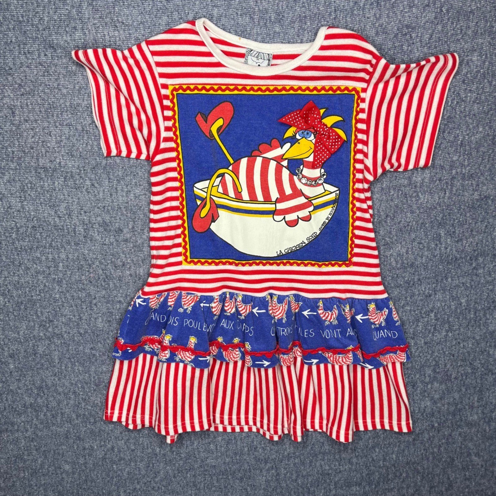 The ruffle is a bit faded. But over all this one is my favorite zoodles. Style: T-Shirt Dress Dress Length: Knee Length Department: Girls Theme: Food & Drink, Letters, Numbers & Words, Cartoon, TV & Movie Characters, Nature Sleeve Length: Short Sleeve Occasion: Casual, Party Fabric Type: Jersey Pattern: Striped Season: Summer, Spring Material: Cotton Blend Keywords: Kids dress, Girls dress, Zoodies dress, Striped dress, Chicken graphic, Ruffle dress, French text, Playful dress, Summer dress, Casual dress, Party dress, Toddler dress, Little girls dress, Cute dress, Whimsical dress