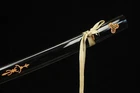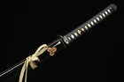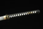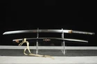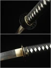 Kill Bill Bride's Samurai Katana Clay Tempered T10 Steel Japanese Samurai Sword ITEM DESCRIPTION SPECIFICATIONS: Overall Length:103cm / 40.6" Nagasa Length:71cm / 27.9" Handle Length:27cm / 10.6" Kissaki Shape:CHU-KISSAKI Blade Shape:SHINOGUI-ZUKURI Motohaba(width near habaki)3.15 cm Sakihaba(width near yokote)2.3 cm Blade Material: Clay Tempered T10 Steel Handle Material:Genuine Ray skin + Hard wooden Tsuba Material:alloy Tsuba Saya Material:hardwood Condition:Brand New 1&Blade is Made of T10 Steel clay tempered material,Real Hamon,Real Razor Sharp ,Without Blood Groove,Full Tang ,Real Weapon ,Combat Ready. 2&Hand Forged Full Tang Blade, after quenching, tempering, annealing heat treat,Clay Tempered ,Water quenched process, Blade edge hardness reach to 60 HRC,The blade is Hand Polished By 13 different grinding processes, Real Razor sharp! 3&the blade surface is very smooth, bright and it is very easily to cut through a thick bamboo tree with a single strike yet, and sharp enough to cut fruit, water bottles,tatami and so on. 4&The blade has the Shinogi-Zukuri blade Shape.Chu-Kissaki,without blood groove ,The Japanese Real Hamon pattern is done in the same process as the traditional method.It requires a lot of skills. 5&Tsuba(Handguard) is made of black iron material,Kashira,fuchi,menuki is made of High Quality Zinc Alloy,,,Habaki,Seppa a is made of copper. 6&The Tsuka (Handle) core is wooden and it is very tightly wrap way cover Ray Skin with artificial black leather ito wrapped. 7&The Saya is made of hard wood material with lacquer finished and wrapped silk sageo NOTE: (1) A silk sword bag comes with the sword. but the wooden stand in below item pictures is NOT included. (2) if you need one wooden stand, please contact me, (3) This Katana can be taken apart fully anytime for maintenance purposes, you can disassemble the sword from the handle by taking out two pegs. (4) Due to our swords are full hand made, so Specs will vary slightly from sword to sword. please understand.