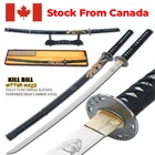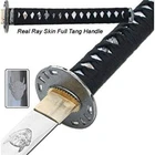 Description: This Hattori Hanzo Demon sword, inspired by Kill Bill, is a fully functional replica meticulously crafted for authenticity. Hand forged from 1060 high carbon steel, it features the genuine movie emblem on the tang and an engraved Demon Emblem on one side of the blade. Wrapped in genuine ray skin and black cotton braid, its handle boasts dragon Munuki ornaments reminiscent of the film. The high-quality hardwood scabbard showcases two engraved Demon emblems on the Fuchi collar. Razor sharp and battle-ready, this sword offers both slicing power and precision, making it ideal for both large and small targets. Key Features: Fully functional replica of the Kill Bill Hattori Hanzo Demon sword Hand forged from 1060 high carbon steel for durability and authenticity Genuine movie insignia on the tang and Demon Emblem engraving on one side of the blade Handle wrapped in genuine ray skin and black cotton braid, adorned with dragon Munuki ornaments High-quality hardwood scabbard with piano finish exterior and engraved Demon emblems on the Fuchi collar Razor sharp blade capable of slicing through large targets with precision for hitting small targets Specifications: Overall Length: 40 inches Blade Length: 29 inches Blade Thickness: 6.7mm Blade: Full Tang, Battle Ready, Razor Sharp Handle Length: 11 inches