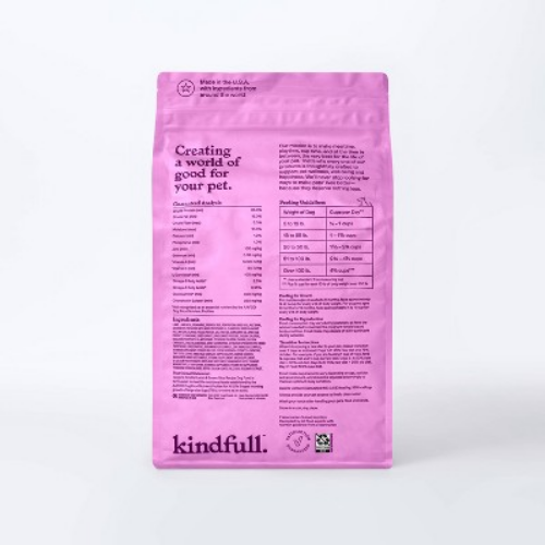 Important Note for Our Valued Customers: To offer you the best prices with free shipping, we occasionally experience shipping delays. If this happens, we’ll notify you immediately, issue a full refund, and invite you to place a new order at your convenience. To keep costs low, we sometimes reuse branded packaging boxes for shipments—we appreciate your understanding if you receive your order in repurposed packaging. Rest assured, all products we sell are 100% brand new, unopened, and freshly manufactured, including pet food and human-grade items, with a minimum 8-month shelf life remaining. If any issues arise, please contact us first—we’re committed to resolving them quickly. If you’re not completely satisfied, we offer a full refund with no hassle. Thank you for your trust and support! Description Kindfull™ Lamb & Brown Rice Recipe Dry Dog Food is made with real pasture-raised lamb as the first ingredient and contains high-quality protein to help support lean muscles. This formula is a source of glucosamine and chondroitin, as well as omega-3 fatty acids for healthy skin and coat. This formula also helps support healthy muscles and bones and contains whole grains. When introducing a new diet to your pet, please transition over 7 days as indicated. Food intake requirements vary depending on age, activity and environment, and should be adjusted accordingly to maintain optimum body condition. Our mission is to make mealtime, playtime, nap time, and all the time in between, the very best for the life of your pet. That’s why every one of our products is thoughtfully crafted to support pet wellness, well-being and happiness. We’ll never stop looking for ways to make pets’ lives better— because they deserve nothing less. Creating a world of good for your pet. Satisfaction guaranteed. highlights Veterinarian-Guided Nutrition: Developed by pet food experts with nutrition guidance from a veterinarian Real pasture-raised lamb is the first ingredient No by-product meals, wheat, corn or soy Natural dog food with added vitamins, minerals & other trace nutrients No artificial flavors, colors or preservatives Made in the U.S.A. with ingredients from around the world Amount : % Daily Value* Crude Protein (Min) 23% Crude Fat (Min) 15% Crude Fiber (Max) 5% Moisture (Max) 10% Calcium (Ca) (Min) 1.2% Phosphorus (P) (Min) 1% Zinc (Min) 100mg/kg Selenium (Min) 0.35mg/kg Vitamin A (Min) 5000IU/Kg Vitamin E (Min) 50IU/Kg L-Carnitine (Min) 100mg/kg Omega-6 Fatty Acids (Min) 2.5% Omega-3 Fatty Acids (Min) 0.25% Glucosamine (Min) 300mg/kg Chondroitin Sulfate (Min) 250mg/kg * Percentage of Daily Values are based on a 2,000 calorie diet. Ingredients: lamb, lamb meal, brown rice, brewers rice, pea protein, dried peas, rice bran, chicken fat (preserved with mixed tocopherols), flaxseeds, dried plain beet pulp, natural flavor, potato protein, salt, fish oil, sunflower oil, dried egg product, l-threonine, dried carrots, dried sweet potatoes, choline chloride, dicalcium phosphate, dl-methionine, potassium chloride, taurine, calcium carbonate, dried blueberries, dried cranberries, citric acid (preservative), mixed tocopherols (preservative), iron amino acid complex, zinc amino acid complex, vitamin e supplement, ferrous sulfate, yucca schidigera extract, l-carnitine, zinc oxide, copper amino acid complex, copper sulfate, sodium selenite, manganese amino acid complex, vitamin a supplement, niacin supplement, d-calcium pantothenate, riboflavin supplement, manganous oxide, thiamine mononitrate, l-tryptophan, vitamin d3 supplement, vitamin b12 supplement, pyridoxine hydrochloride, biotin, calcium iodate, folic acid, rosemary extract.