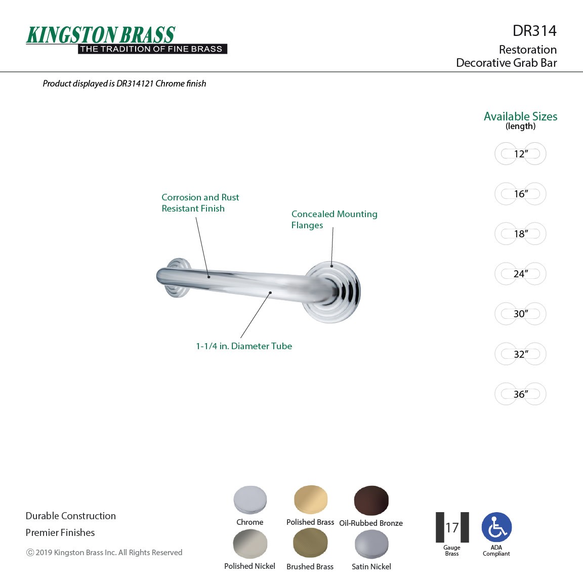 Powered by Frooition Top Products Kitchen Bathroom Lighting Fans Hardware Decor & Organization Kingston Brass DR31432 Restoration 32" Grab Bar Overview Item Description Kingston Brass grab bars are beautifully designed to offer not only an aid in preventing falls, but unique style. Useful for all ages, these can be located in showers, near toilets, or in any customized location. This particular grab bar resourcefully provides support as it enhances a traditional style. Kingston Brass DR31432 Features: Covered under Kingston Brass's 1 year limited warranty Constructed of brass All hardware required for installation of grab bar is included Coordinates with products from the Restoration line seamlessly Complies with ADA standards Kingston Brass DR31432 Specifications: Overall Width: 35-1/16" (from left to right of product) Center to Center: 35-1/16" (distance between installation centers) Projection (Depth): 2-3/4" (wall to edge of product) Why Choose BuildInc? OUR PROMISE TO YOU About Us At Build, we promise to provide the best selection we can, most competitive pricing, and unmatched customer service. Our store has quality home improvement products from trusted manufacturers like Moen, American Standard, Delta, Kraus, Kichler, Progress Lighting, Schlage, Kwikset, Baldwin, Broan, NuTone, Air King, and Rev-A-Shelf. With over 200,000 home improvement products for you to choose from, we have just what you need to get your project done. Fast & Free Shipping We promise to make it our priority to get you your items as fast as we can. We ship from 440 warehouses around the country, ensuring that your product will get to you as soon as possible. We know you're eager to get your hands on your new purchase, we would be too. As a bonus, most items ship for free. Returns We are happy to accept returns of unused or defective items for a refund within 30 days from the date of delivery. For returns outside 30 days, please contact our Customer Service team to go over our options. For full details, please view the Shipping and Payments tab above. To initiate a return simply go to the eBay Returns Portal and submit a return request. We ask that all items be returned with all original components via a traceable method. Once your return is received and processed, we will quickly get your refund or replacement issued. If for any reason you are unsatisfied with your purchase or for product or warranty questions, please contact Customer Service team for assistance. More Items! View more great items Innovations Lighting 516-5CR-15-23 Hadley Chandelier Hadley 5 - White $728.20 Glass Warehouse GW-SFP-27.5 Vela 78"H x 27-1/2"W Shower Screen - Bronze $395.71 Innovations Lighting 209 Large Oxford Large Oxford 2 Light 25"W - Nickel $754.60 Glass Warehouse GW-SFP-30.5 Vela 78"H x 30-1/2"W Shower Screen - Bronze $412.37 About Us | Shipping | Returns | Contact Us | FAQ | Collections | Special Offers! Powered by Frooition Frooition Frooition | No-js Template | eBay design, eBay store design, eBay shop design, eBay template design, eBay listing design (ver:froo_no_js) This listing is currently undergoing maintenance, we apologize for any inconvenience caused.