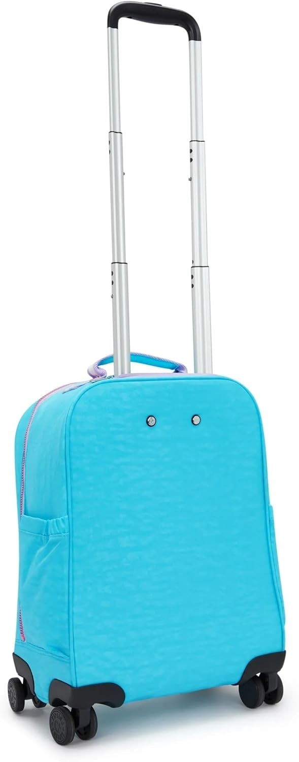 The Kipling Mese Rolling Backpack in Galaxy Turquoise is a stylish and spacious backpack designed for women. Made of durable polyester and nylon, it features a solid blue exterior with metallic finish and black nylon handle/strap. The backpack has a zip closure and is perfect for carrying your belongings in style for any occasion. Brand new with tags, this Kipling backpack is a must-have for anyone looking for a fashionable and functional accessory.