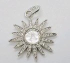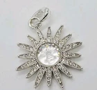 This open ring charm cradles a Seaview Moonstone at its center, its benevolent face encircled by a radiant crystal starburst that sparkles like a constellation come to life. It pulses with cosmic wonder, as if tiny fragments of the starlit cosmos have been captured to orbit gracefully in the wearer's atmosphere. Plated Sterling Silvertone. Measures approximately 1 3/4" wide x 1 1/4" long.