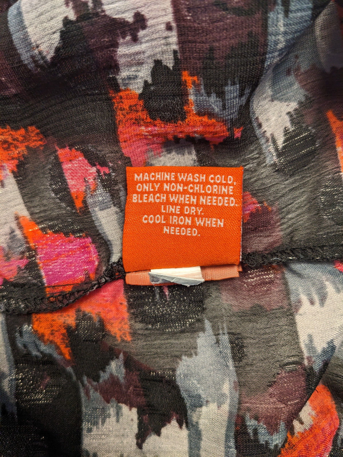 Kirna Zabete at Target sleeveless blouse with neck tie in black, silver, grey, red, purple abstract pattern Tie at neck an be worn multiple ways, sleeveless, v-neck with collar, shimmery Fabric Content - 100% polyester Care Instructions - Machine wash, line dry See photos for condition Size XL - See photos for measurements G3