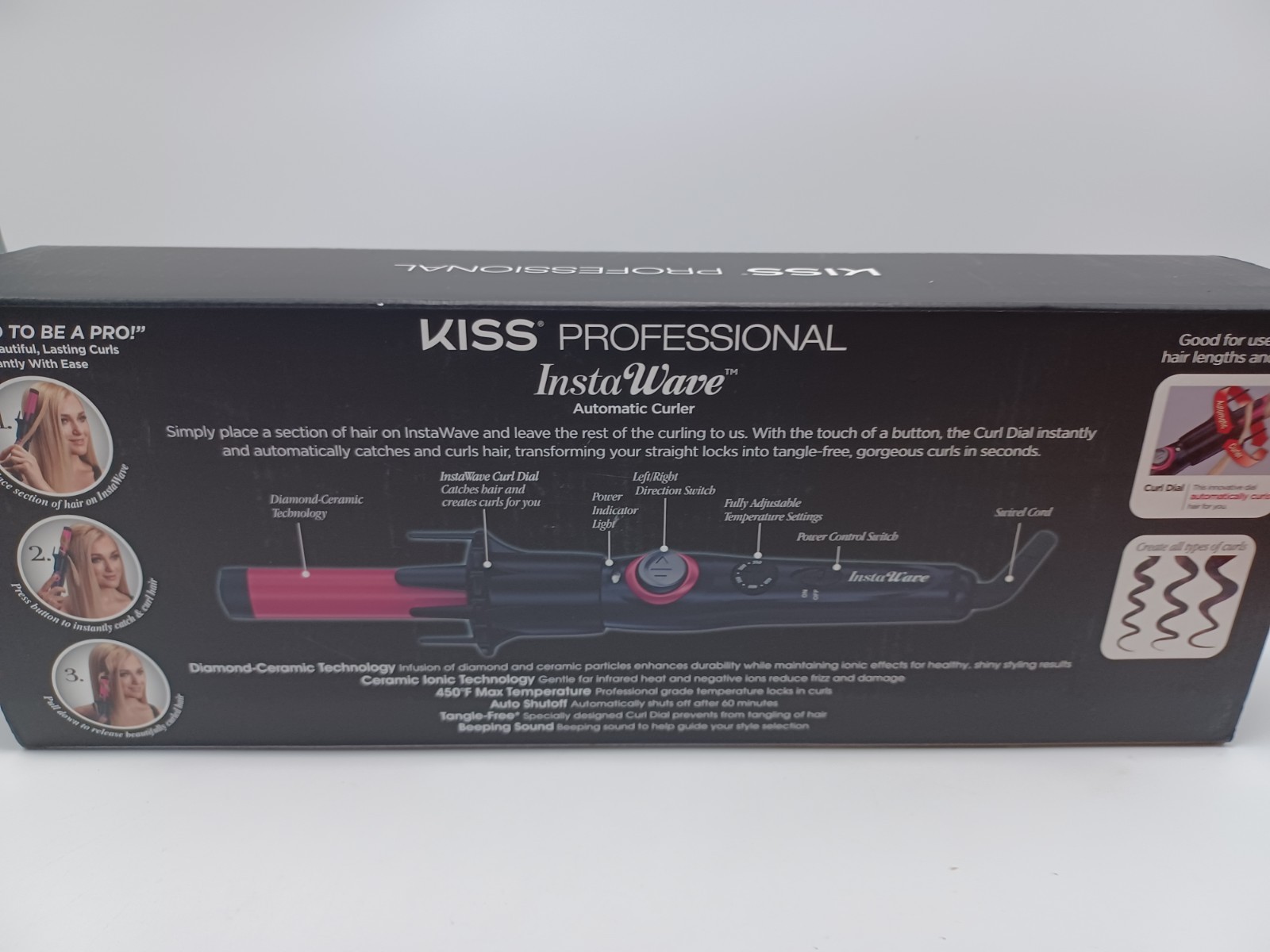 Kiss Professional InstaWave Automatic Curling Iron PACI01 450 Max Temp 7m5. Kiss Professional Instawave Automatic curler Preowned but barely used. In like new box. 3lbs shipped ●○●○● Please note: On details.... Please review pictures and descriptions carefully and ask all questions before you bid. On feedback... I would appreciate positive feedback and always leave my customers positive feedback on good transactions. On concerns or issues.... PLEASE CONTACT ME FIRST, if there are any issues with your item. Please avoid negative or neutral feedback until I have had a chance to resolve any issues. Avoid opening a case and deal with me directly. I always reply quickly to my customers. On shipping.... I DO NOT offer overnight or Fedex shipping but do package & ship quickly. Many of my listings indicate Standard or Retail Shipping. I make an effort to ship faster methods, most often Priority or First Class, but reserve the right to ship standard mail if necessary (for large or heavier items usually). Make all shipping adjustment requests BEFORE buying. Reduced shipping is usually not available for discounted or best offer price reduced items. Shipping unavoidably calculates high for my Western US Buyers. Some small or medium sized items that are not going First Class can be reduced. Make an offer or make a shipping adjustment request BEFORE you buy. On items... I endeavor to inspect all items for any defects and do not sell such items unless these defects are listed or pictured. Of course, I can miss things at times. I also take plenty of photos so please inspect these carefully as they are part of the description. To keep my prices low, I am only able to spot clean items and do not meticulously clean or dry clean used items. Measurements are approximate. On returns.... I work with my customers however I can. However, please understand that I am RARELY ever able to refund shipping costs because these are nonrefundable to me. Return shipping is the responsibility of the buyer.●○●○● Please note: On details.... Please review pictures and descriptions carefully and ask all questions before you bid. On feedback... I would appreciate positive feedback and always leave my customers positive feedback on good transactions. On concerns or issues.... PLEASE CONTACT ME FIRST, if there are any issues with your item. Please avoid negative or neutral feedback until I have had a chance to resolve any issues. Avoid opening a case and deal with me directly. I always reply quickly to my customers. On shipping.... I DO NOT offer overnight or Fedex shipping but do package & ship quickly. Many of my listings indicate Standard or Retail Shipping. I make an effort to ship faster methods, most often Priority or First Class, but reserve the right to ship standard mail if necessary (for large or heavier items usually). Make all shipping adjustment requests BEFORE buying. Reduced shipping is usually not available for discounted or best offer price reduced items. Shipping unavoidably calculates high for my Western US Buyers. Some small or medium sized items that are not going First Class can be reduced. Make an offer or make a shipping adjustment request BEFORE you buy. On items... I endeavor to inspect all items for any defects and do not sell such items unless these defects are listed or pictured. Of course, I can miss things at times. I also take plenty of photos so please inspect these carefully as they are part of the description. To keep my prices low, I am only able to spot clean items and do not meticulously clean or dry clean used items. Measurements are approximate. On returns.... I work with my customers however I can. However, please understand that I am RARELY ever able to refund shipping costs because these are nonrefundable to me. Return shipping is the responsibility of the buyer.