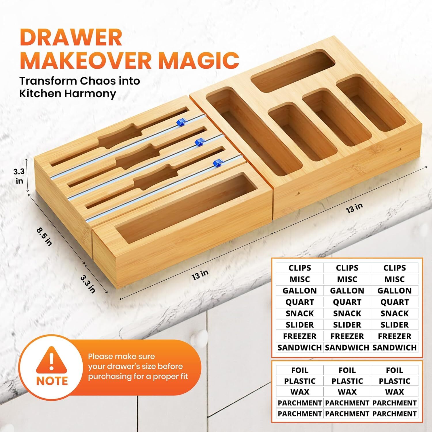 You may also like Extra Strong Self-Sealing Bicycle Tube 29in Puncture Proof Tire Replacement New 12.56 USD 13.22 USD Free shipping 5% off Cool Touch 2 Slice Toaster Extra Wide Slots 6 Shade Settings Crumb Tray New 31.89 USD 33.57 USD Free shipping 5% off 32 Gallon Heavy-Duty Trash Can W/ Snap-On Lid Venting Channels Outdoor Use 50.6 USD 53.26 USD Free shipping 5% off Durable Geometric Medallion Indoor Outdoor Area Rug Weather Resistant Easy Care 49.32 USD 51.92 USD Free shipping 5% off Grain Free Wet Cat Food Variety Pack Tuna Chicken Salmon Veggies 12 Cups New 23.43 USD 24.66 USD Free shipping 5% off Decorative Chicken Wire Storage Basket W/ Wooden Handles Home Organization New 12.58 USD 13.24 USD Free shipping 5% off 12 Piece Dinnerware Set Stoneware Service Four Dishwasher Microwave Safe New 49.37 USD 51.97 USD Free shipping 5% off Adjustable Ironing Board W/ Pad & Cover Lightweight Durable Steel Frame New 33.19 USD 34.94 USD Free shipping 5% off 20in Kids Bicycle Easy Ride Single Speed W/ Padded Seat & Coaster Brake New 71.63 USD 75.4 USD Free shipping 5% off 1 Gallon Penny Candy Glass Jar with Lid for Kitchens/pantries Storage Organizer 13.03 USD 13.72 USD Free shipping 5% off Slim Kitchen Step Trash Can 10.5 Gallon Soft Close Hands-Free Waste Disposal New 49.37 USD 51.97 USD Free shipping 5% off LED Desk Organizer Lamp W/ AC Outlet Flexible Gooseneck Warm Light Home Office 18.01 USD 18.96 USD Free shipping 5% off Bag Storage Organizer with Foil and Saran Wrap Dispenser With Cutter For Kitchen Drawer - 9 in 1 Bamboo Plastic Food Bag Storage Containers Perfect For Gallon, Quart Bags & 12" Rolls Color Natural Material Bamboo Product Dimensions 6.3"L x 12.2"W x 13.5"H Item Weight 5.9 Pounds About this item 9 IN 1 Baggie & Wrap Organizer: This aluminum foil organization and storage set comes with a 3 in1 foil and plastic wrap organizer with cutters perfect for foil, plastic saran wrap, and wax paper. Transform Your Kitchen: Elevate your kitchen look with our premium 9 in 1 storage bag organizer that comes with a built-in tin foil, saran wrap and wax paper dispenser holder! Our plastic wrap dispenser with cutter is crafted with durable MOSO bamboo leaving a timeless look. Detachable & Connectable: The drawer organizer for food storage bags and foil is designed to fulfill all your storage requirements. Connect it and put onto your walls or detach for placement on drawers or countertops. Take control of organizing wrap rolls and baggies your way! Upgraded Foil Cutter & Labels Included: Our upgraded slide cutters effortlessly cuts your desired size of foil with precision and no worry of rolls being crunched up. We’ve also included an assortment of labels to help identify your wraps or bags easier. You may also like Set of 3 Basic Tabletop Picture Frames Front Loading Vertical Horizontal Display 9.89 USD 10.41 USD Free shipping 5% off Wall Picture Frame 16x20 Front Loading Gallery Display Art Home Décor Gifts New 12.17 USD 12.81 USD Free shipping 5% off 6 Inch Nonstick Carbon Steel Springform Cake Pan Rust Scratch Resistant Bakeware 10.36 USD 10.91 USD Free shipping 5% off Heavy Duty Shooting Rest Adjustable Recoil Reducing Steel Frame Durable Support 92.32 USD 97.18 USD Free shipping 5% off 7 in 1 Metal Hose Spray Gun Flow Control 7 Spray Patterns Non-Slip Grip New 46.72 USD 49.18 USD Free shipping 5% off Gaming Chair Video Rocker Ergonomic PU Faux Leather Kids Teens Durable New 49.4 USD 52.0 USD Free shipping 5% off Lift-Top Desk and Chair for Toddlers and Kids Reading Drawing Homework Bedroom 95.01 USD 100.01 USD Free shipping 5% off CD Stereo System Bluetooth USB Charging 100W RMS FM Presets LED Lights 104.97 USD 110.5 USD Free shipping 5% off 21 Gallon Multipurpose Drawstring Trash Bags 45 Count Leakproof Durable New 14.74 USD 15.52 USD Free shipping 5% off 24 Inch Leaf Rake Wood Handle Polypropylene Head Yard Maintenance Tool New 17.99 USD 18.94 USD Free shipping 5% off 5ft Foldable Table Indoor Outdoor Camping Durable Portable Heavy Duty Use 55.55 USD 58.47 USD Free shipping 5% off 20x25x1 MERV 1 Air Filter 4 Pack Furnace AC Replacement Durable Efficient New 13.5 USD 14.21 USD Free shipping 5% off
