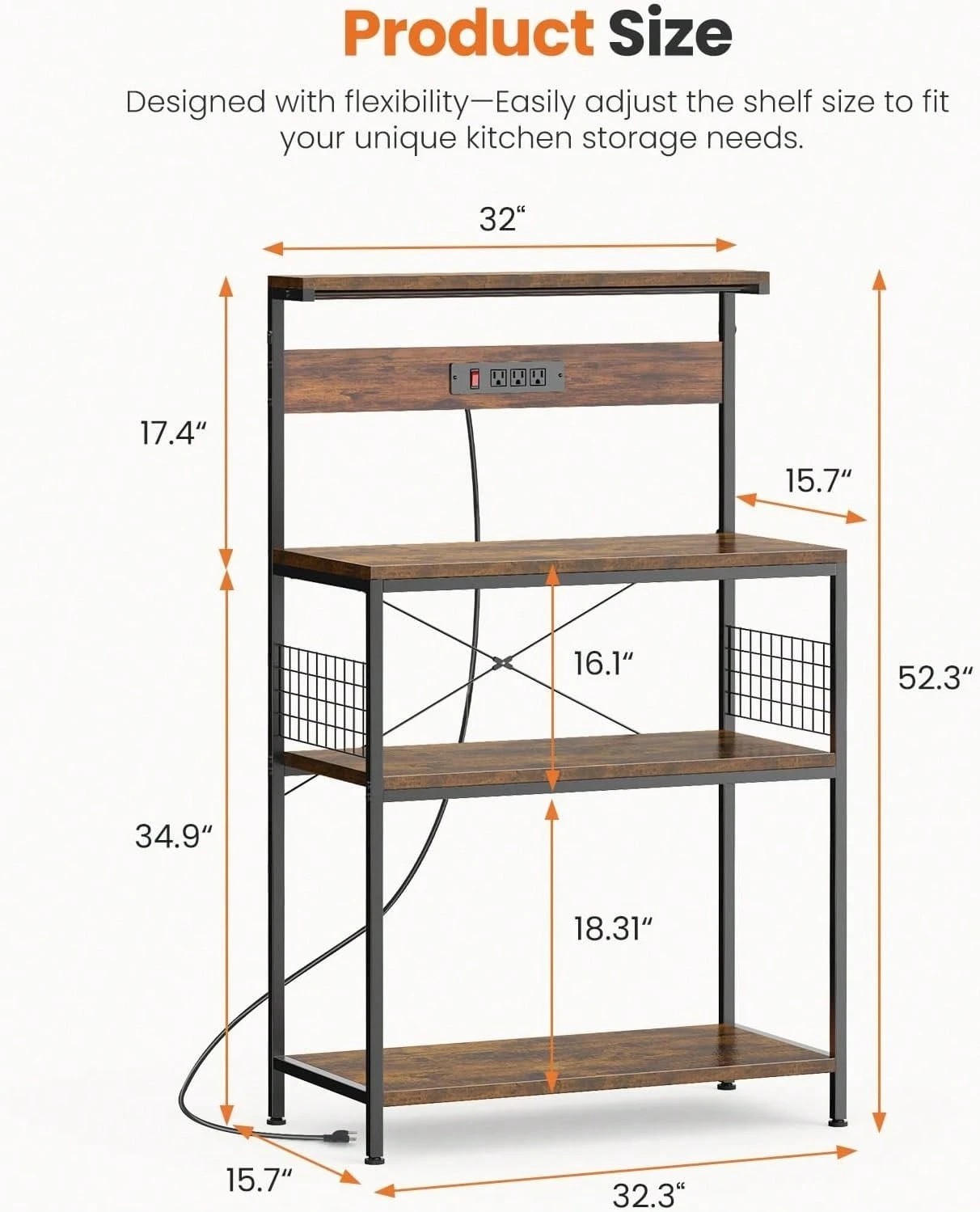 ☕ Transform Your Kitchen into a Gourmet Coffee Station! ☕ Upgrade your kitchen organization with the Sweetcrispy 4-Tier Bakers Rack . Designed with a built-in power outlet and a stylish rustic brown finish, this versatile rack is the ultimate solution for small spaces. Whether you need a dedicated coffee bar, a microwave stand, or a sturdy organizer for your heavy appliances, this freestanding station delivers both function and charm to your home! 🍳🍞✨ 🚀 Key Features You'll Love Integrated Power Outlet: Features a convenient built-in charging station with 2 AC outlets and 2 USB ports , allowing you to plug in your coffee maker, toaster, or air fryer directly into the rack. 🔌⚡ Massive 4-Tier Storage: Provides ample vertical space to organize your microwave, spice jars, cookbooks, and kitchen accessories across 4 spacious shelves . Adjustable Middle Shelves: Customize your storage! The middle shelves can be adjusted to different heights to perfectly accommodate tall blenders or large microwave ovens. 🔄 Rock-Solid Stability: Built with a reinforced heavy-duty metal frame and high-quality thickened boards to prevent wobbling, even under a heavy load of appliances. 💪 Rustic Industrial Style: The beautiful Rustic Brown wood finish combined with the black metal frame adds a modern industrial touch to any kitchen or dining room. 🏡 Bonus S-Hooks: Includes side hooks to hang oven mitts, mugs, or cooking utensils, keeping everything you need within arm's reach. 🥄 📏 Product Specifications Feature Details Brand Sweetcrispy Tiers 4-Tier Vertical Design Built-in Power 2 AC Outlets + 2 USB Ports Material Heavy-Duty Metal & Premium Engineered Wood Color Rustic Brown / Black Width 32 Inches Type Freestanding Appliance Organizer 💡 Perfect For Every Room Kitchen: Use it as a classic bakers rack or a microwave oven stand to free up valuable counter space. Dining Room: The perfect height for a stylish Coffee Bar Table or a wine rack station. Pantry: Organize dry goods, large pots, and heavy appliances with ease. 📦 Package Includes: 1 x 4-Tier Kitchen Bakers Rack 1 x Power Outlet Strip (Built-in) Assembly Tool Kit & Hardware Step-by-Step Instruction Manual