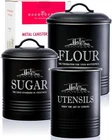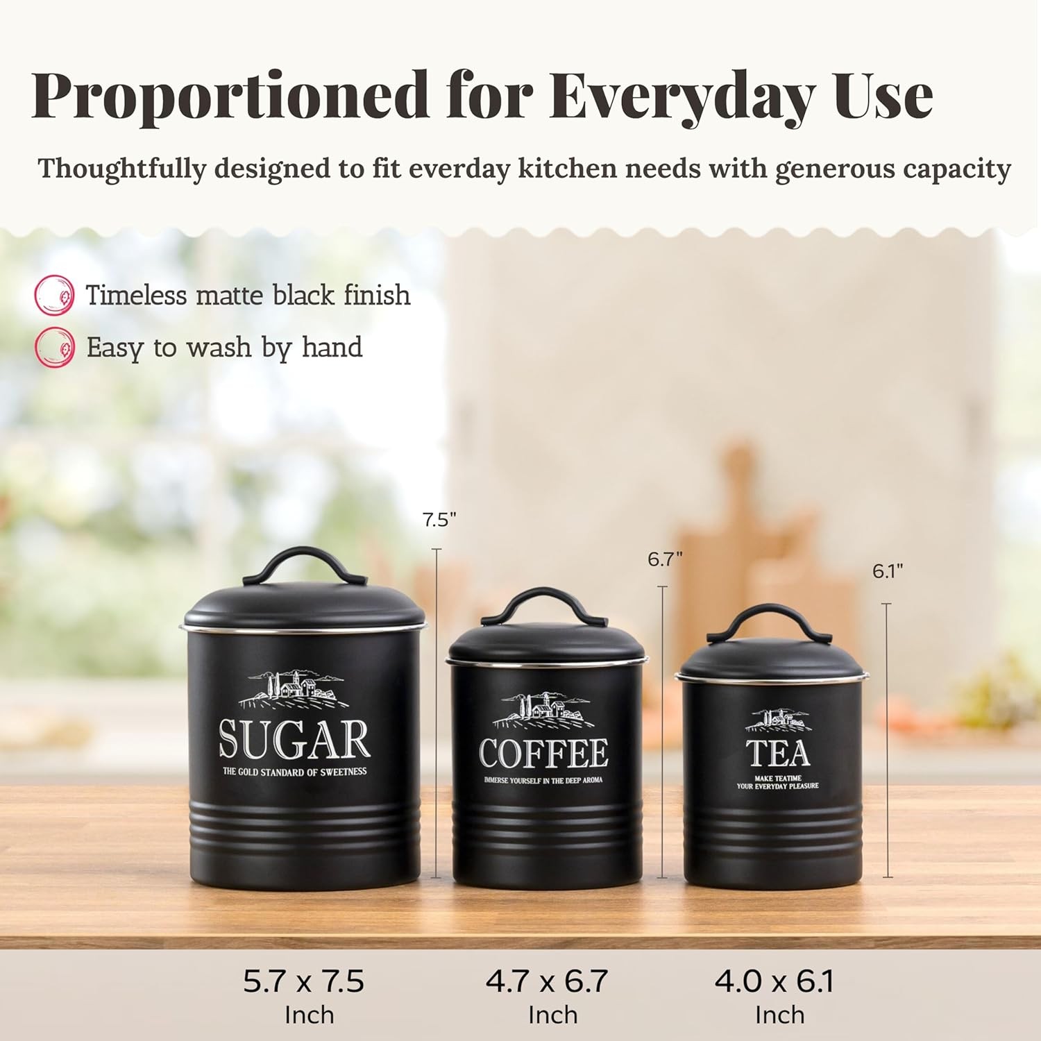 About this item All You Need, Thoughtfully Together: A harmonized 3-piece set with sugar, coffee and tea canisters in timeless matte black, thoughtfully built as a kitchen storage canister set that brings together everything you need with beauty and function in quiet harmony. Airtight Seals for Everyday Freshness: Silicone-sealed lids create an airtight seal to help preserve flavor, keep moisture out and shield contents from light, so your sugar, coffee and tea stay fresh and dry. Gracefully Made, Built to Last: These kitchen canisters for countertop are crafted from lightweight yet sturdy, food-safe, rust-resistant metal that’s easy to handle and clean by hand, designed to live gracefully on your counter every day. Thoughtfully Proportioned for Everyday Use: Sized for everyday kitchens with about 8 cups for sugar, 5 for coffee and 3.5 for tea, keeping your daily essentials within easy reach—compact on your counter, generous in what they hold. Timeless Farmhouse Warmth: Bring the quiet charm of Dreamy Hills into your home with our country-vintage collection, crafted to add gentle warmth and a touch of farmhouse elegance to everyday life. Beautifully packaged for gifting, designed for daily use, and made to feel like home — where everyday moments feel a little more special. Brand: Color: Matte Black Material: Metal Material Feature: Food Grade, Lead free, Hand Wash Only Capacity: 8 Cups