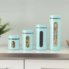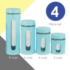 Store candy, sugar, trail mix and more with this 4 piece Canister Set. Made of heavy duty steel, it features a clear window along the center of the base to allow you easily see the contents of each canister. The vibrant finish adds a splash a color to your kitchen and provides a fun way to neatly organize your food. STORES SNACKS, CANDY, AND DRY INGREDIENTS: For all of your loose dry foods that need sturdy storage, use this sturdy set of four canisters to help provide storage. Place coffee beans, rice, flour, sugar, cereal, and candies inside for easy access MADE FROM QUALITY GLASS AND METAL WITH SEE-THROUGH WINDOWS: Each kitchen storage container is crafted from quality glass and a metal finish, with an illuminating finish that adds a bold modern touch to your kitchen. At the fronts of all four of them are clear windows for easily viewing your items. All the canisters are also equipped with twist-off lids that secure your contents PLACE ANYWHERE FOR A RETRO LOOK: These canisters are able to be placed anywhere in your household from a table to the countertop to help provide a stylishly retro look. They can also be stored more discreetly in your pantry or cabinet STORES OTHER ITEMS: Along with food, these pantry organization and storage canisters also provide storage for other items as well. Place pens, pins, clips, hair accessories, and even small jewelry inside for simple storage FOUR DIFFERENT SIZES FOR ALL YOUR FOOD STORAGE NEEDS: Four canisters are included, which vary in different sizes, and whether you are storing a lot or little, you will always have the right canister to accompany you. The capacities for these containers are 2 1/2 cups, 4 cups, 5.5 cups, and 7.5 cups