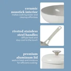 WHAT'S IN THE BOX: two frying pans (8 inches and 10 inches), two saucepans with lids (1.5 quarts and 2 quarts), one 3-quart sauté pan with lid and one 5-quart Dutch oven with lid HAPPINESS IS HOMEMADE: Kitchen Essentials is all about making and sharing good food at home together. from preparing the freshest ingredients to the beautiful mess of cooking a family recipe, we encourage you to roll up your sleeves, mix up a happy kitchen, and set the table for free-flowing conversations over an easy, generous, and crowd-pleasing meal. CERAMIC NONSTICK COOKWARE: easy-release interior makes more room for healthier cooking options and less time for cleanup. HEAVY-GAUGE ALUMINUM COOKWARE: durable aluminum pots and pans cook evenly to serve happy and homemade meals every day. they feature a rounder and wider shape, similar to a traditional caldero, to faciliate smooth and easy stirring. INDUCTION-FRIENDLY: works on induction, gas, electric, halogen, ceramic and glass stoves