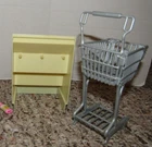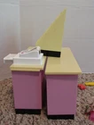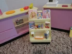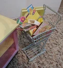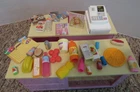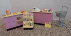 Kitchen Littles Mini Mart by Tyco who later was absorbed by Mattel is a grocery or convenience store for Barbie and similar size doll. This one is not complete and this lot contains pieces from various sets. The counters and magazine rack/food shelf are in good condition, no breaks/cracks. The cash register does have some paint chipping on top corners as photographed. The wheels are missing on the shopping cart. I cleaned the battery compartment and it with batteries (not included) the cash register makes noise, changes price display and the button on counter lights and makes noise. The cash register will open without batteries. Also included are various food grocery items and Barbie magazines. My home is pet-free and smoke-free, but I am not the original owner. No smoke or pet odors detected. I will combine shipping on items closing within two days of this listing's end. Payment is due within two days of listing's end. Please ask questions before bidding, as all sales are final, no refunds allowed. I do NOT cancel transactions or bids, so be sure this is what you want before bidding. I do not add handling to shipping cost quoted by ebay.