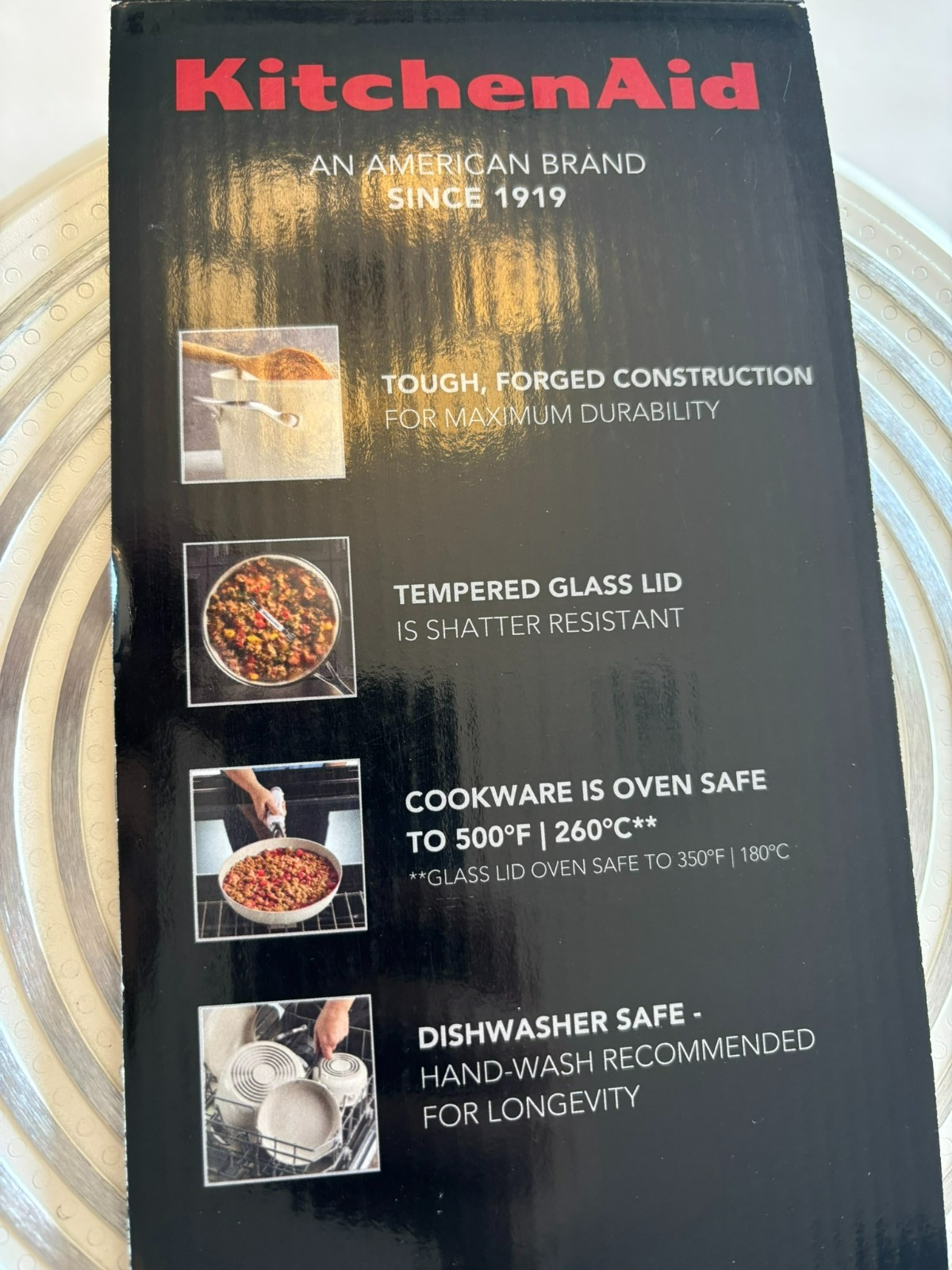 KitchenAid Hard Anodized Ceramic Induction Nonstick Cookware Frying Pan/Skillet with Lid, Dishwasher Safe, 12.25 Inch Non Stick Fry Pan with Stainless Steel Handle - Porcelain White *There is a small mar on bottom of pan from shipping, see pictures* Features Approx. dimensions: 19.75"L x 12"W x 2.8"H; approx. weight: 2.6 lbs. Hard-anodized aluminum cookware is eight times stronger than aluminum and ensures fast, even heating High-performance ceramic nonstick is crafted for consistent food release Tempered-glass lid seals in moisture and heat Oven safe to 500°F, lid to 350°F Compatible with all cooktops, including induction Manufacturer's limited lifetime warranty Aluminum Dishwasher safe Imported I'm an avid eBay-er and buy way more than I sell, so I know how important pictures and descriptions are. If you have any questions please do not hesitate to ask. I typically ship within 24 business hours of receiving payment.