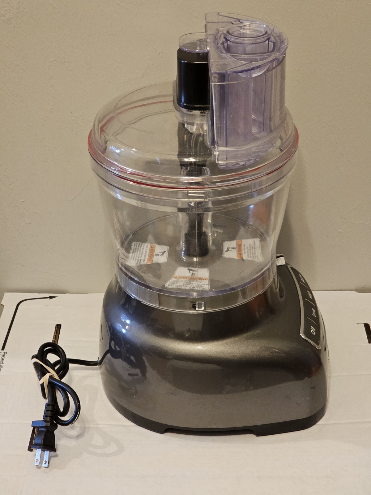 This KitchenAid 13 cup Food Processor Model KFP1333QG0 is the perfect addition to any kitchen. With a variety of capabilities such as blend, chop, slice, grate, and shred, this food processor is perfect for processing a multitude of foods including nuts, fruit, juice, vegetables, and meat. It comes with three speeds and two blades to ensure that your food is processed to perfection. The electric food processor is made of durable plastic and has a silver color. It has a capacity of 13 cups and is designed to be multifunctional. The components included in this food processor are blades, bowl, and base. It is Energy Star certified and has a voltage of 120V. This KitchenAid food processor is a must-have for any home and is sure to make your life easier. The food processor is in great pre-owned condition. Please see all the pictures for the condition and more details.