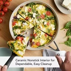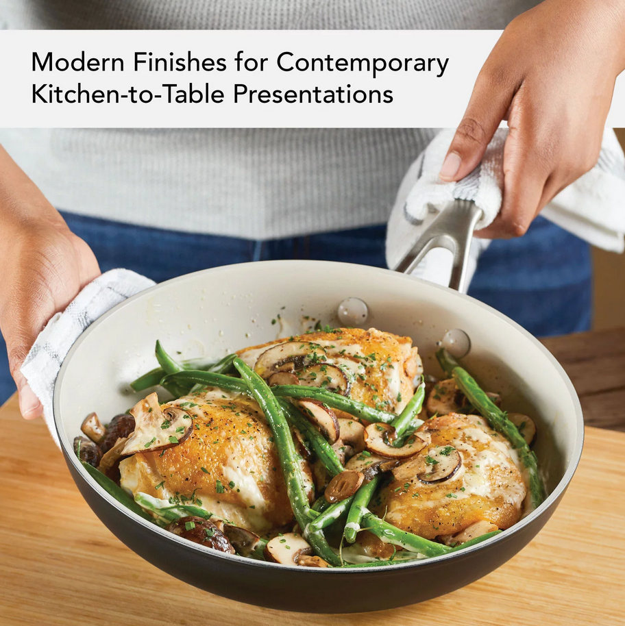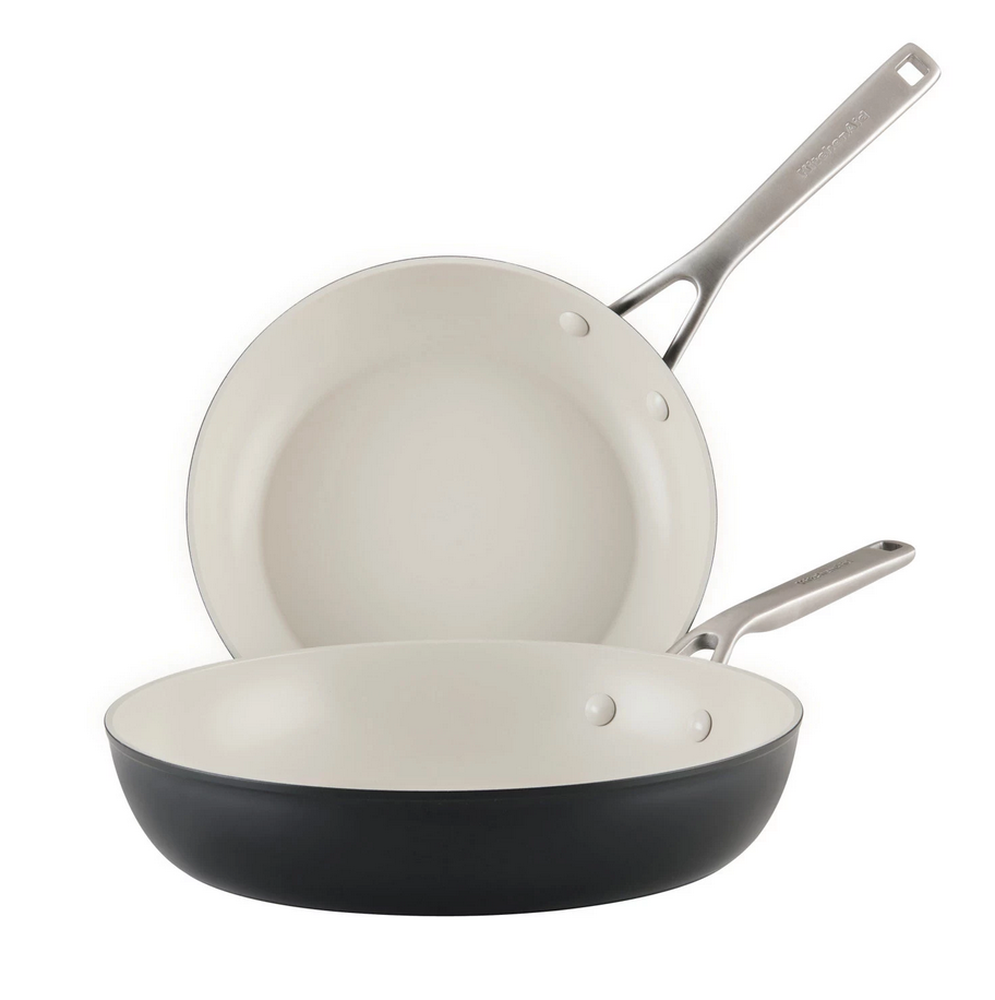 KitchenAid Hard Anodized Ceramic Nonstick 2-Piece Fry Pan Set Highlights Set Includes: Use this 8-inch frying pan and 10-inch frying pan combo for versatility to cook delicious main recipes and sides at the same time Easy-Clean Ceramic: Made without PFAS, BPA, Lead, or Cadmium (Manufacturing process does not involve adding to the product any of these substances which may otherwise be present in the environment) Tough, Forged Construction: 8x harder than aluminum for lasting performance with thick, forged base for fast and even heat conduction Kitchen to Table Design: Color-finished in a modern Matte Black hue for a standout, contemporary look from performance to presentation Control and Convenience : Double-riveted, stainless steel handle on each pan provides confidence and control from stovetop to oven to table Range and Repertoire : Build on your collection of go-to recipes with versatile cookware that is oven safe to 500ºF for taking on the widest range of stove-to-oven creativity Made for everyday cooking and beautiful kitchen-to-table presentations, the KitchenAid Hard Anodized Ceramic Nonstick Frying Pans are finished with an easy-clean, ceramic nonstick interior and a durable hard-anodized exterior, crafted with thick, forged aluminum bases and rims to deliver excellent heat conduction and durability. This versatile 10-inch and 12.25inch frying pans are 8x harder than aluminum for lasting performance and features a long-lasting ceramic nonstick, so you'll need less oil (for healthier cooking) but still get fast and easy cleanup of sticky and saucy recipes. Oven safe to 500ºF, this ceramic nonstick skillet is finished in a modern matte black color to suit the contemporary kitchen, features a double-riveted handle for control from stove to oven to table, and will have your kitchen equipped to make the most of any meal.