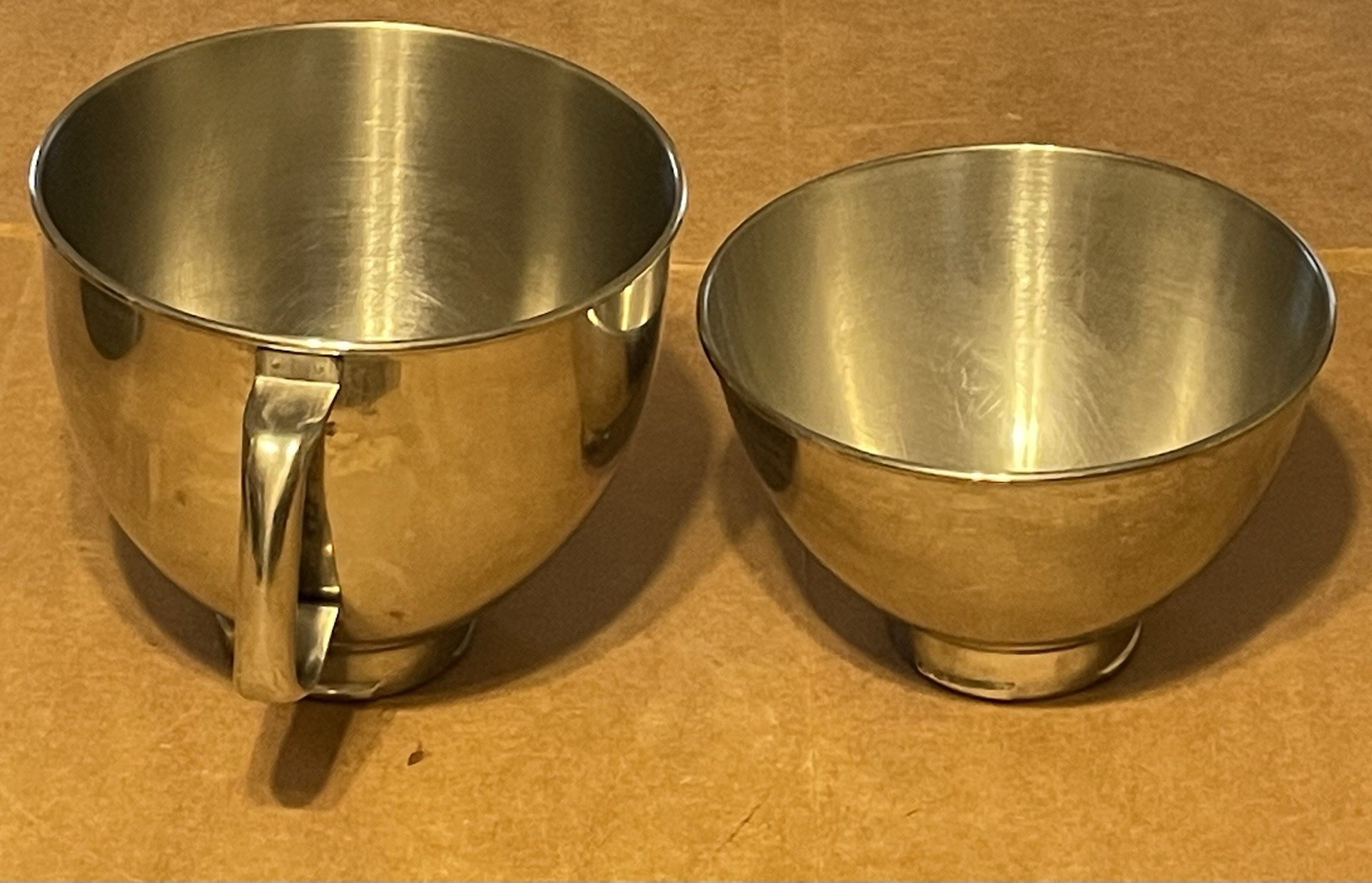 KITCHENAID ARTISAN TILT-HEAD 325W MIXER KSM150PSOB 2 STAINLESS STEEL MIXING BOWLS WITH & WITHOUT HANDLE. THEY HAVE SOME SCRATCHES DUE TO NORMAL USAGE. MIXING BOWLS ONLY. INCLUDES ONLY ITEM PICTURED. PLEASE VIEW PHOTOS FOR MORE DETAILS. BUY WITH CONFIDENCE. WE ACCEPT PAYPAL AND SHIP ONLY WITHIN THE USA. RETURN ACCEPTED. ITEM WILL BE SHIPPED ONCE THE PAYMENT IS RECEIVED. GOOD LUCK BUYERS!