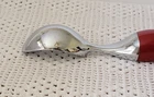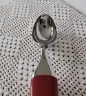 KitchenAid ice cream scoop with a red handle in good used condition. Mild scratches from normal use. Measures about 8 1/2" long. There is a hole for hanging. Made of stainless steel and plastic.