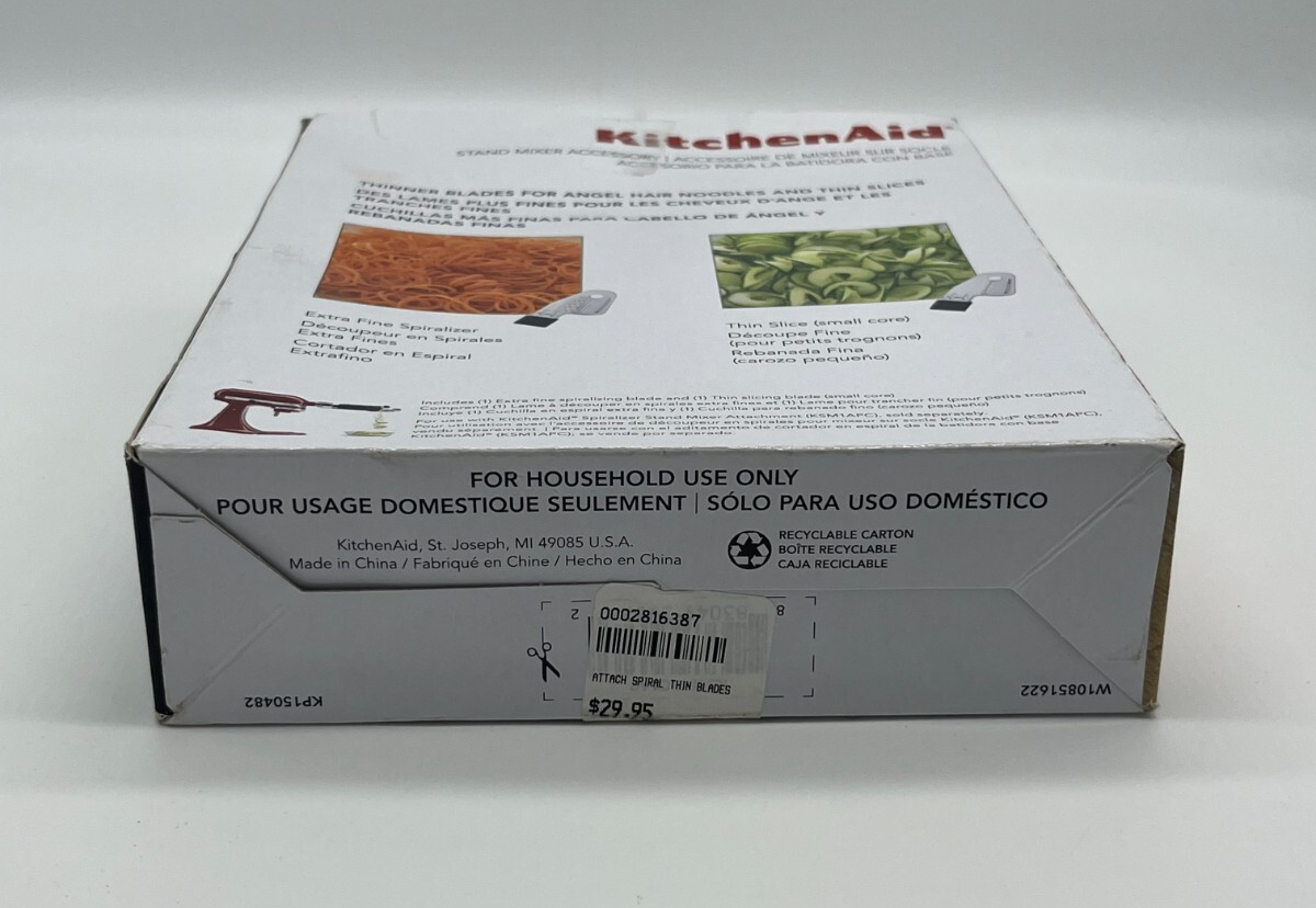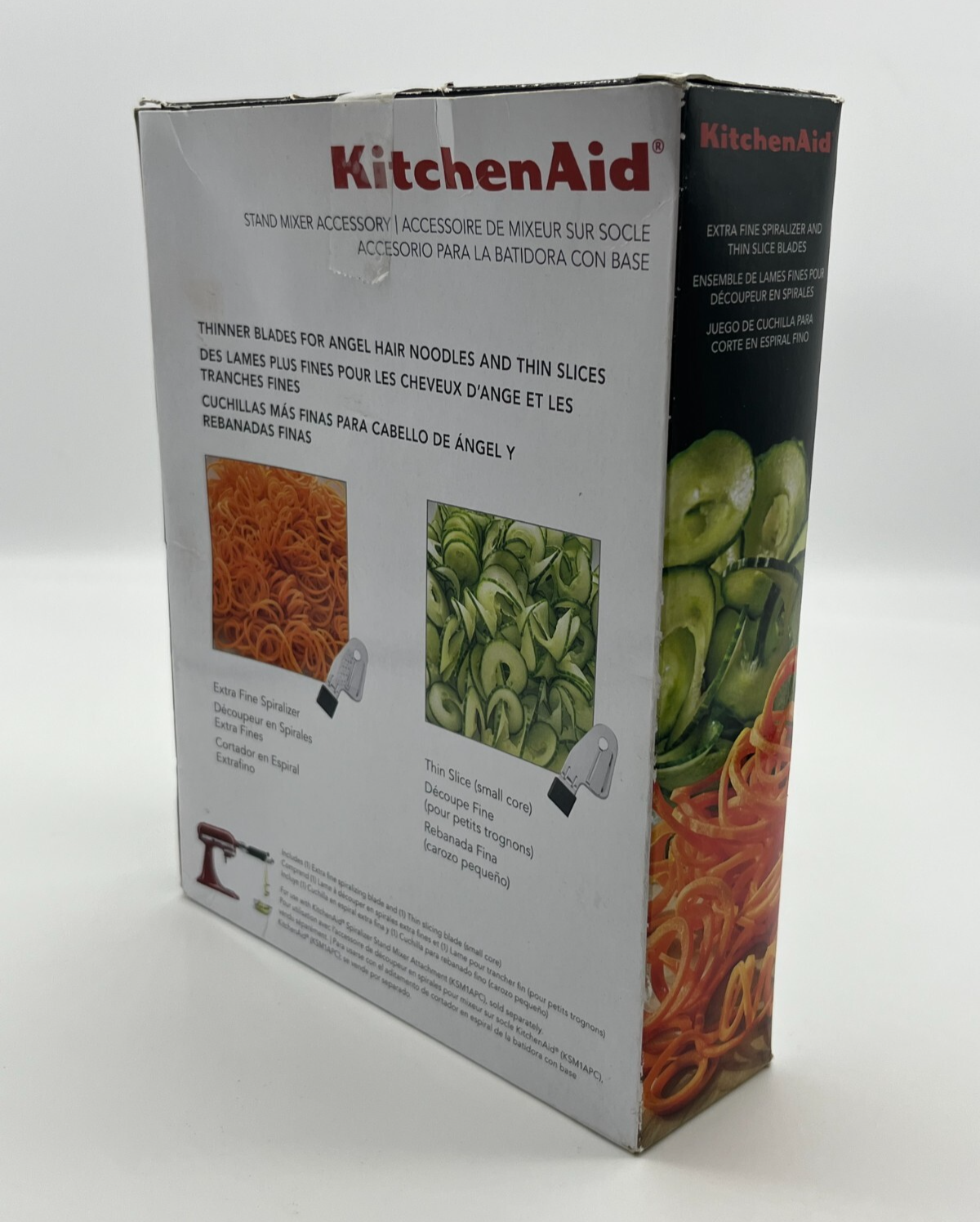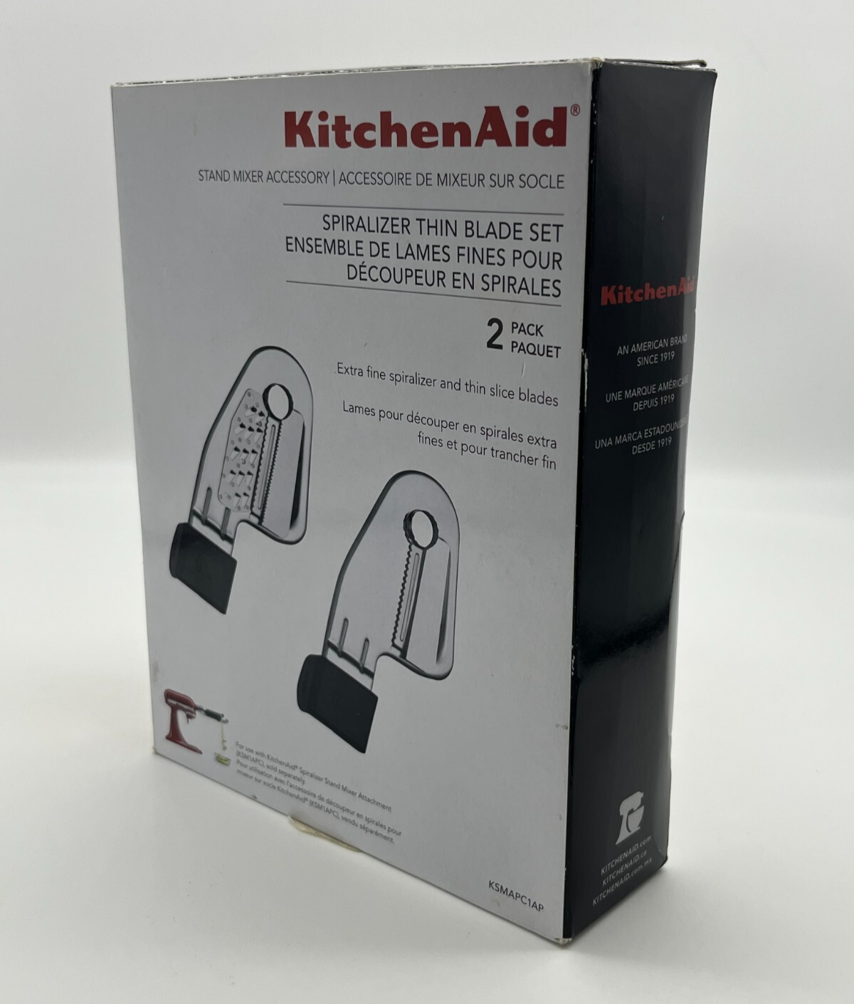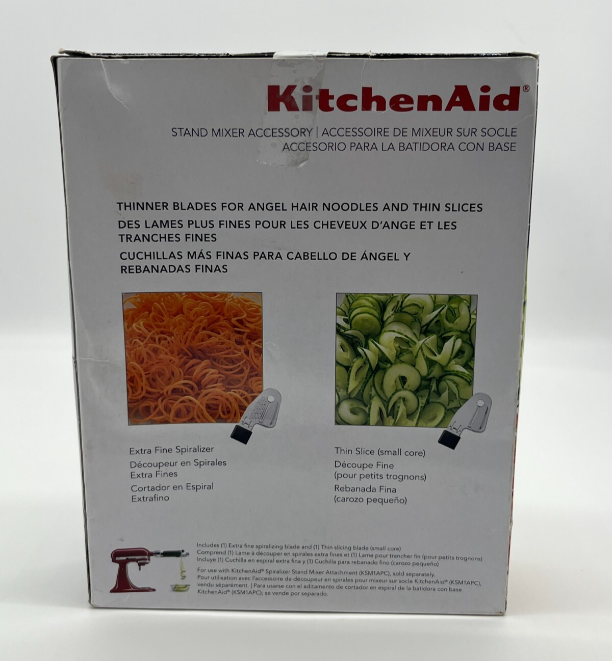 The KitchenAid KSMAPC1AP Thin Blade Set for Spiralizer Attachment is a set of 2 stainless steel blades designed for spiralizing vegetables and fruits. The blades are silver in color and are interchangeable, allowing for versatile use in the kitchen. Specifically designed for the KitchenAid brand, this set is a perfect addition to any stand mixer for easy and efficient spiralizing. Condition: Box has been opened, but both blades have been confirmed as present and totally pristine/unused. Thanks for looking!