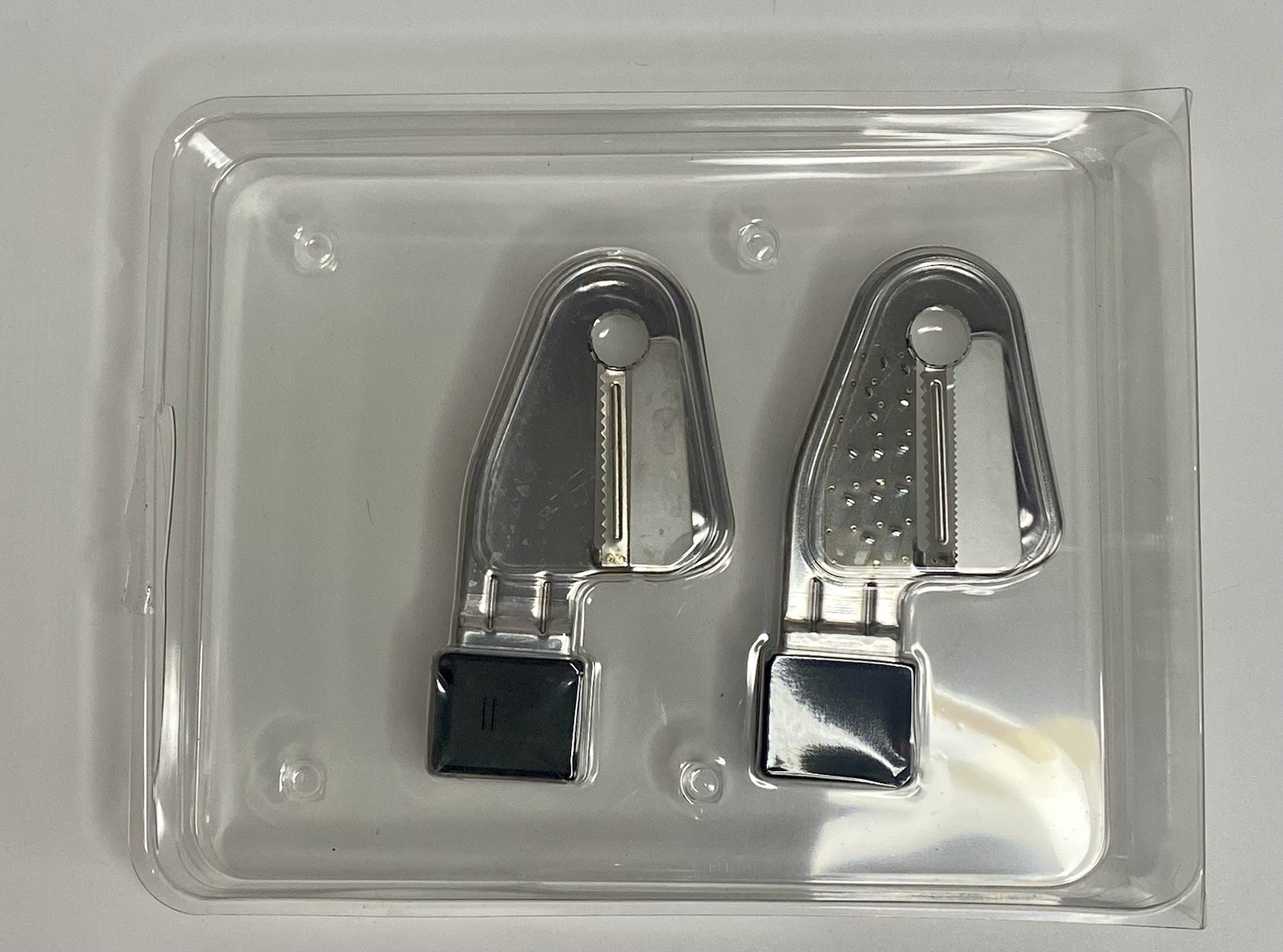 The KitchenAid KSMAPC1AP Thin Blade Set for Spiralizer includes 2 stainless steel blades designed specifically for the KitchenAid spiralizer. The blades are silver in color and compatible with vegetables and fruit. This set is an essential addition to your kitchen tools, making it easy to create spiralized vegetables and fruit for a variety of recipes. Open box. Box has some wear