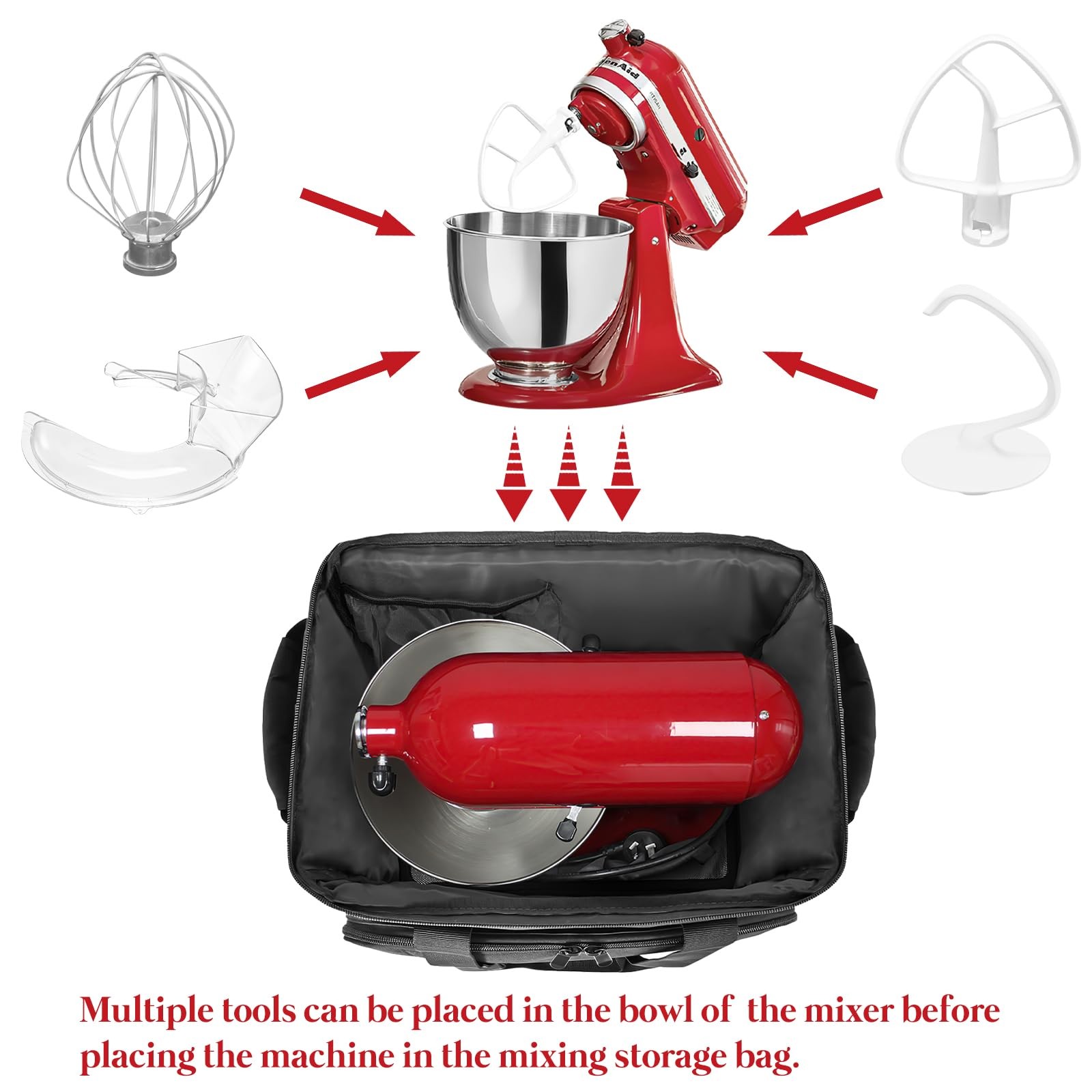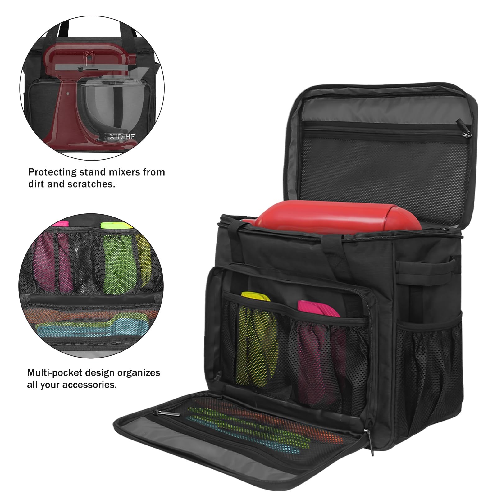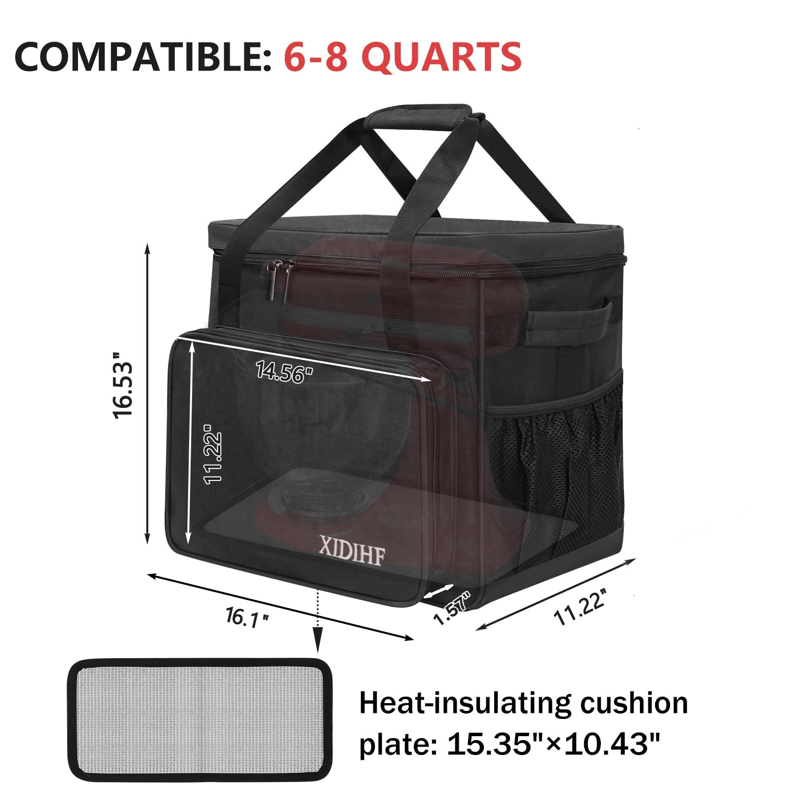 This portable mixer storage bag is made of high-quality Oxford fabric, meticulous workmanship, sturdy sewing process, wider and thicker handle to prevent strangulation, strong load-bearing capacity. Whether it is class, work or camping, you can easily travel, all-round protection, for the food escort. Suitable for 6-8 quart mixer Material: Oxford Size: 16*11.2*16.5in Color: black 4 ways to carry: shoulder, handheld, hand-carried, luggage pole handling Bottom: with 4 thick rubber non-slip pads to prevent scratching Double zipper design: the use of high-quality zipper, double chain head design to open the bag more convenient and smooth Widened and thickened handle: with Velcro fastening, soft padded design to carry more comfortable, in order to strengthen the load-bearing capacity Pocket design: 4 open pockets inside, 1 zippered mesh pocket on top, 1 zippered mesh pocket + 2 open mesh pockets in the front compartment, large velcro pocket on the back, 2 open mesh pockets on the outside 【 Perfect Design 】This portable storage bag does not include any accessories. Measures 16''X11.2''X16.5'', the main compartment fits for KitchenAid mixers 6-Quart, 7-Quart and 8-Quart. Please measure your mixer brand and size before purchasing. 【 Safety Protection 】The mixer storage box compatible with kitchenaid is made of high quality fabric with a waterproof removable thick bottom pad, which can better increase the bag's weight capacity while protecting your valuable stand mixer from harm, and is easy to clean, just wipe it gently with a cloth. 4 thick rubber pads on the bottom to prevent scraping. 【 Multi-pocket Storage 】9 pockets. This mixer bag compatible with kitchenaid can not only store your Mixer, but also place all the extra accessories, with multiple pockets in the front compartment for storage, side pockets for water glasses, and a large pocket in the back for recipe books. 【 Easy to Carry 】The comfortable mixer storage bag provides you with four ways to carry it. Adjustable and removable shoulder strap allows this storage bag to be used as a shoulder bag, the shoulder strap has padded and soft padded design can provide maximum comfort and reduce your fatigue. The 2-in-1 carry handle design can help you carry it well, and the back of the bag has elastic straps specially designed for luggage, which can be put on the luggage bar to carry it, freeing your hands. 【 Perfect Service 】Please do not worry about the crease after receiving the goods, unfold the storage for a period of time will disappear.If you have any quality problems with our mixer carrying bag, please feel free to contact us, we will provide you with a satisfactory solution.