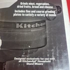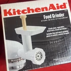 The product is a KitchenAid Food Grinder Attachment designed for KitchenAid Stand Mixers. It is a manual meat grinder in white color with a model number FGA-2. The attachment is made of plastic and comes with one blade. It also includes a stand for easy use. The item is new old stock (NOS) and comes with its original box and papers, making it a convenient addition to any kitchen for grinding meat efficiently.
